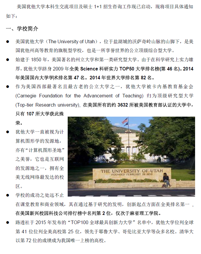 美国犹他大学本科生交流项目及硕士1+1项目简介