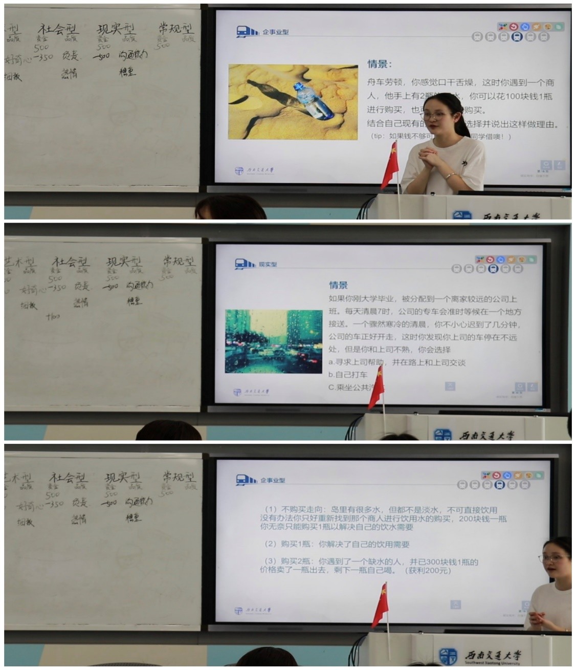 在现场热烈的气氛中,班会进入第四个环节“大富翁历险”。同学们将利用现有的资金和品质进行冒险,并运用自己的聪明才智化解岛屿上遇到的考验。每个岛屿都会有一个情景考验,同学们根据自己的品质做出选择,并讲出选择的理由。这个游戏考验大家对突发情况的应变能力,同时也为大家简单模拟职业生涯中可能遇到的挑战。