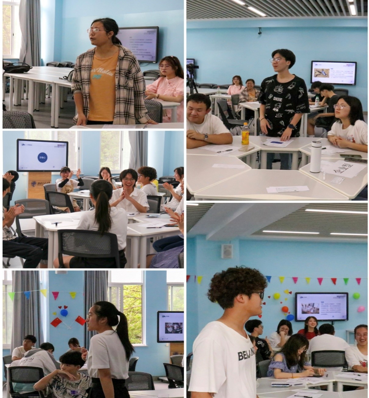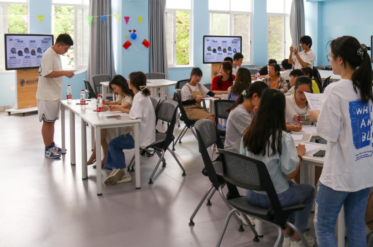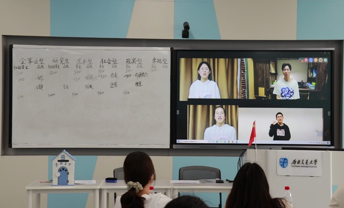 紧接着,班长邀请了莫代玉和同学们同玩热身小游戏。大家限时接力用画画的方式描绘主持人给出的职业。通过这个小游戏同学们看到了大家对于同一职业的不同理解,既活跃了现场气氛,也很好地呼应了生涯规划的主题。