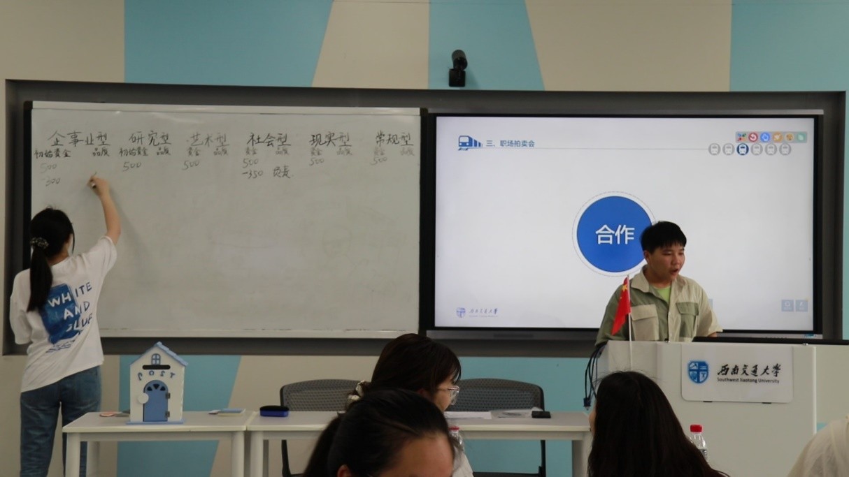 接着,班会进入第三个环节“职场拍卖会”。这个环节与上个游戏相联系,让选择相同岛屿的同学为一组,并通过拍卖获得需要的品质来为小组登岛做准备。活动由黄家仪同学担任拍卖官,进行了“好奇心”、“负责”、“合作”、“沟通能力”四个品质的拍卖。其中,社会型小组“豪掷千金”,用全部的初始资金拍得“沟通能力”这一举动令人印象深刻。拍卖环节中各个小组对于同一品质竞拍热情的差异,也反应出同学们职业兴趣的差异。