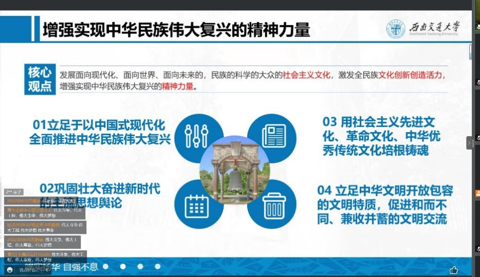 会议伊始,冷书恒向我们详细介绍了党的二十大报告中提及的精神,如伟大建党精神、钉钉子精神和斗争精神等,并向我们深刻地阐释了各种精神的深刻内涵。过程中,同学们积极交流互动,进行了更加全面深入的学习。