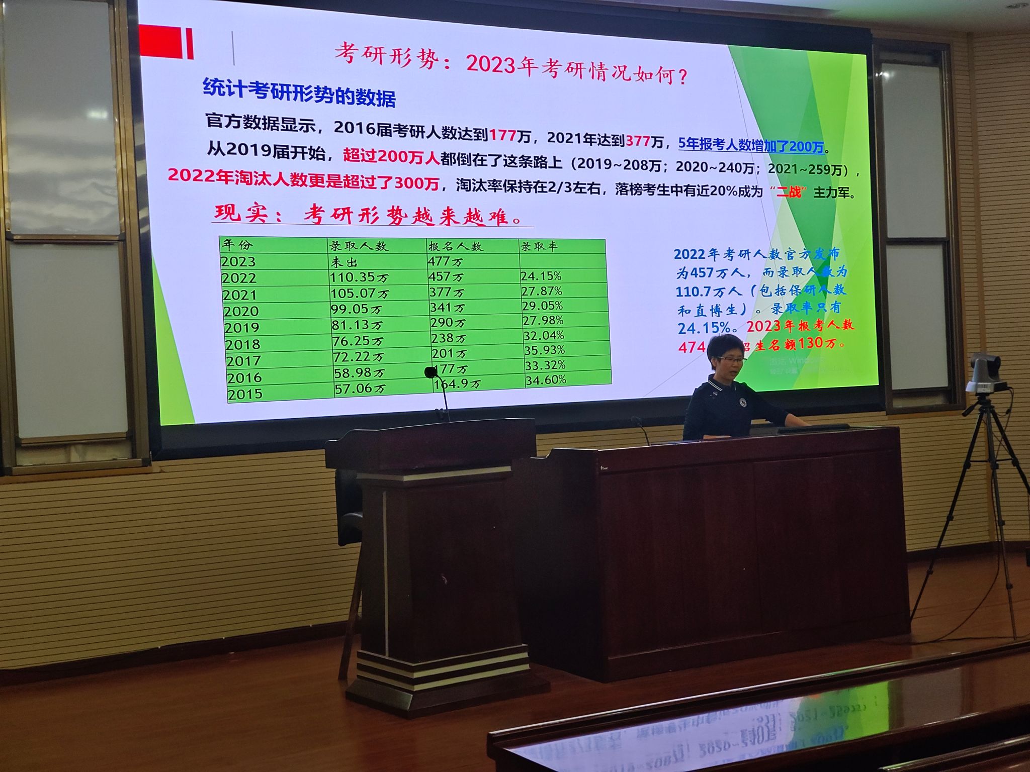 王老师首先从新冠疫情对就业的影响、就业竞争大就业压力大、毕业生心态变化、用人单位对毕业生的需求变化几个方面给同学们介绍了当前的就业形势与未来趋势。王老师给同学们分析了社会单位特别是企业开展校园招聘的节奏及秋招和春招的不同;介绍了目前的考研形势及公司员工考研的一些基本情况。在毕业去向方面,王老师介绍了老员工毕业时可能有的去向选择,重点介绍了升学这一选项,国(境)内升学及选择和出国(境)升学两种选择及不同。