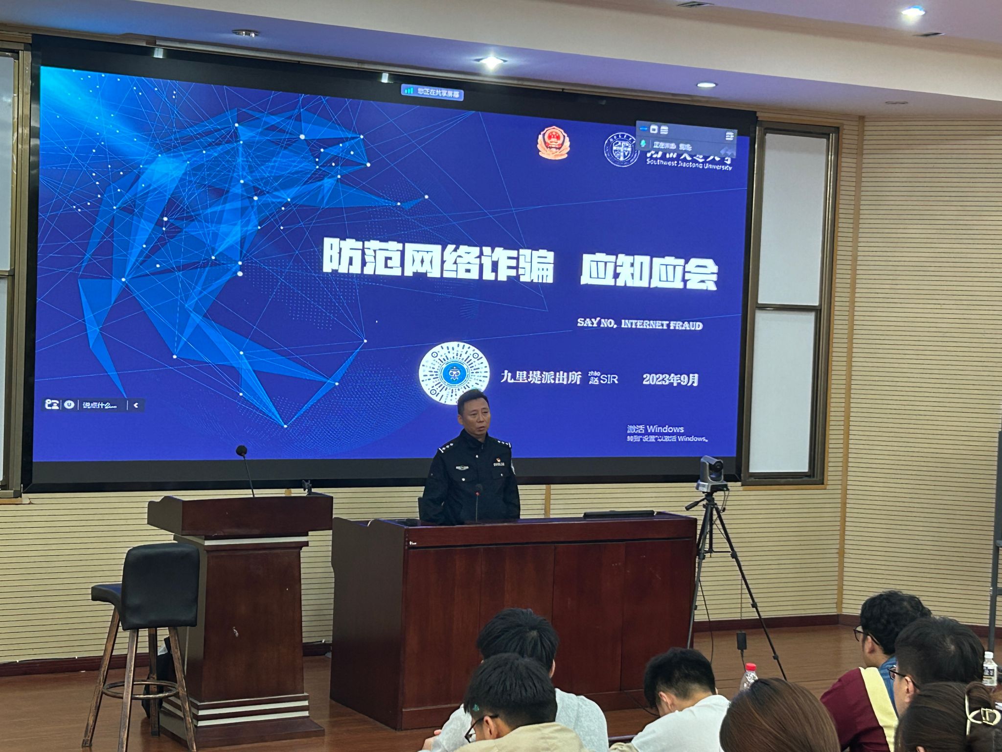 2023年10月12日,下午4点,在0202教室,beats365邀请九里堤派出所民警为全体研究生新生开展了一场反诈讲座。讲座邀请到了九里堤派出所具有多年防诈经验的民警赵磊主讲,研究生辅导员贺小轩、李勇也出席了讲座。