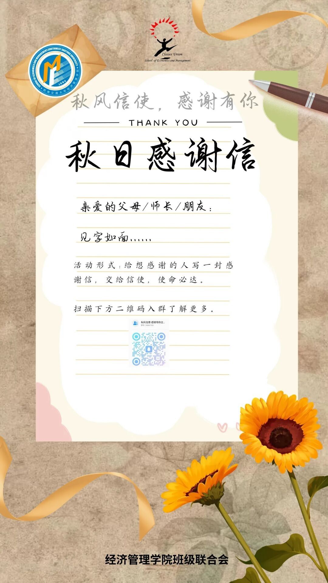 生活中会遇到许多烦恼与困难,这时总有人向我们伸出援手,可能是养育我们的父母、教导我们的老师,也可能是陪伴我们的朋友、朝夕相处的同学,甚至可能是一个陌生人。为帮助同学们传递温暖,常怀感恩,beats365班级联合会10月10日至17日举办“秋风信使,感谢有你”主题心理活动,帮助同学们积极表达、关爱他人,进一步弘扬社会正能量,从而助力同学们的心理健康发展。