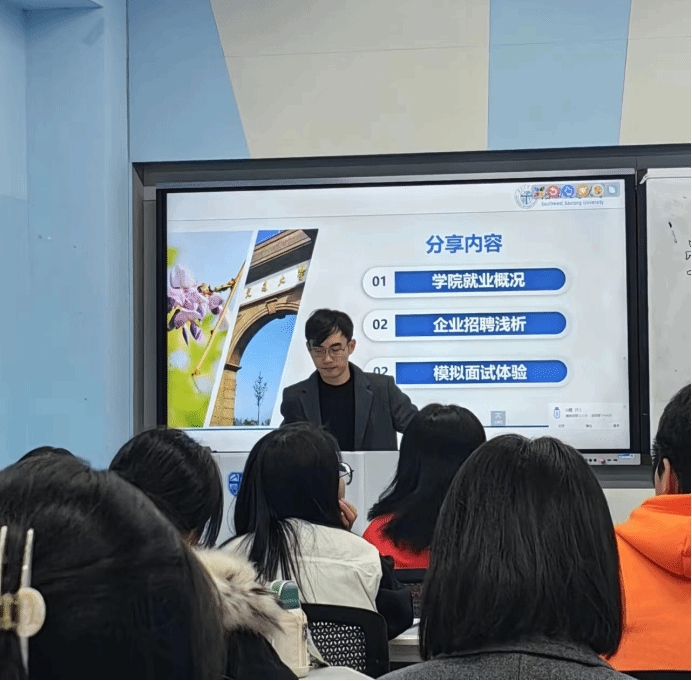整个就业指导工作坊分为三个板块,包括公司就业概况、企业招聘浅析以及模拟面试体验。在公司就业概况板块,苏扬老师向同学们展示了2023届本科毕业生的毕业去向,有保研考研的学长学姐,也有收到了就业和留学offer的学长学姐。在了解了就业概况后,同学们对于自己未来的方向有了一个更加清晰的认识。
