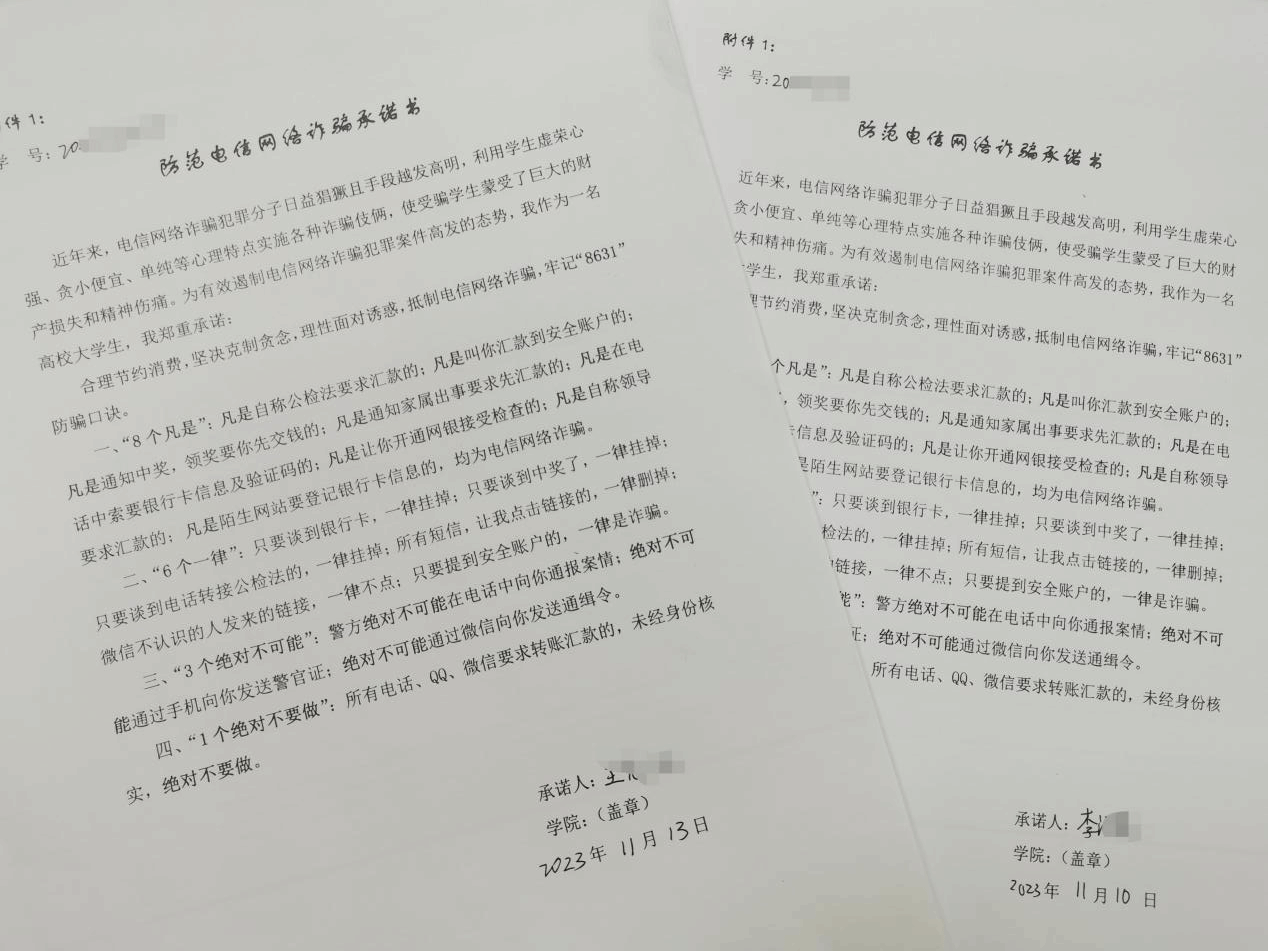 以公司保卫处及金牛区派出所做的防诈骗教育专题讲座为基础,beats365本科2023级通过主题班会、年级大会等开展防范电信网络诈骗教育,组织新生学习反诈知识,组织新生签署防范电信网络诈骗承诺书和《拒绝买卖、转借、转租手机卡、银行卡等涉嫌违法犯罪承诺书》,提高同学们防骗意识和防骗能力。