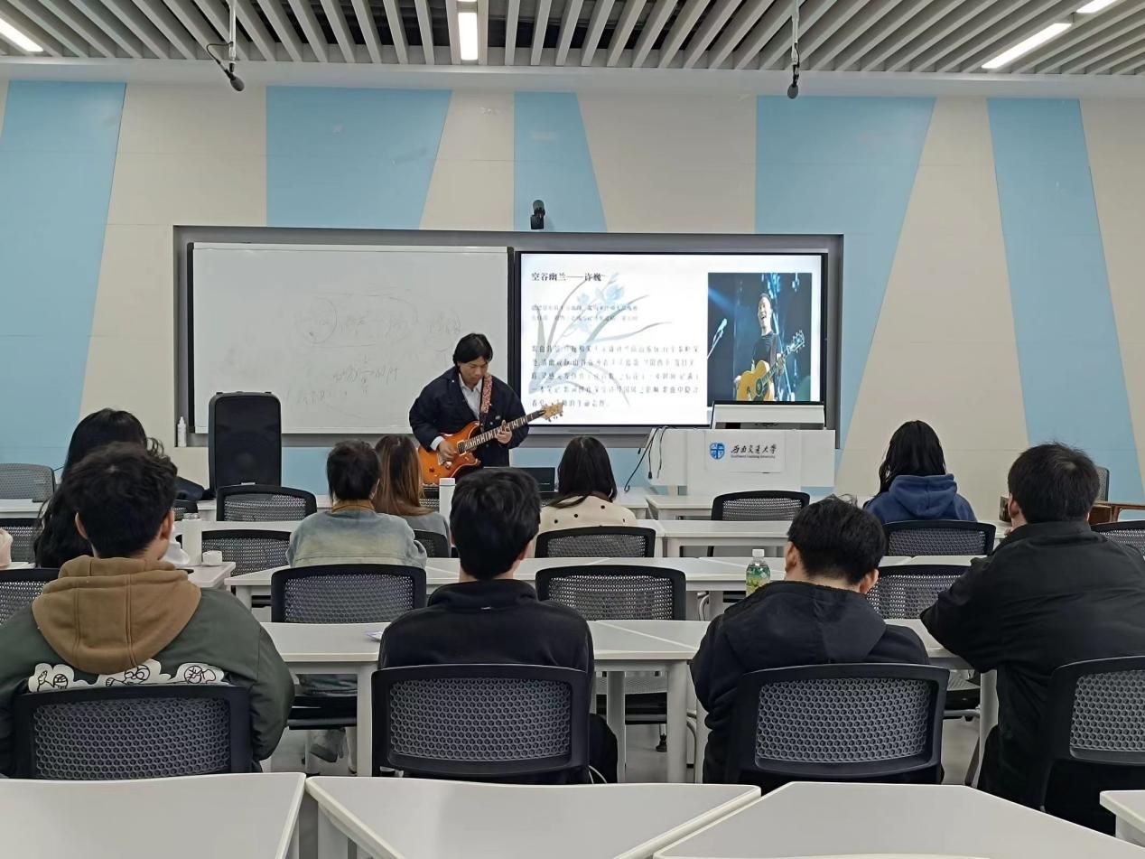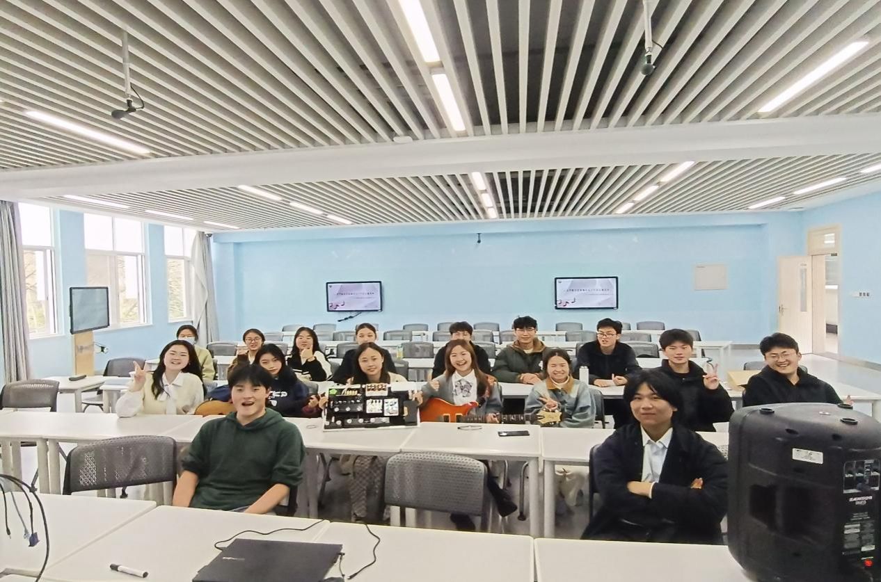 本次班会邀请到了人文公司“音乐下午茶”出品团队为班级同学带来"吉他菜单——和你在交大的街头走一走",首先由周玉豪同学讲述吉他的相关知识,携团队其他成员一起为大家演奏著名吉他曲,最后讲演团队带领经济一班全体成员一起弹奏吉他,激发同学们对音乐的热爱。
