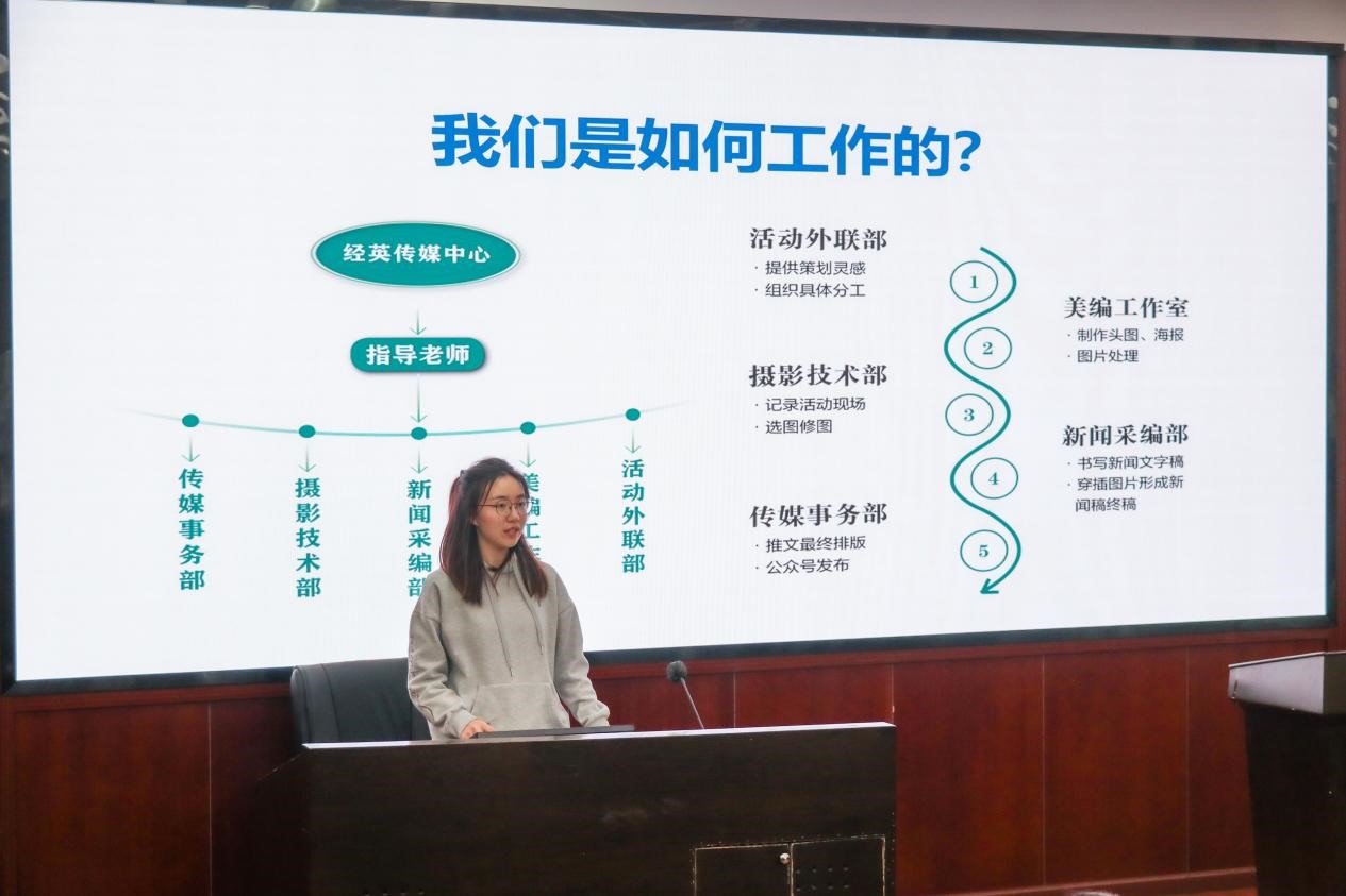 经英传媒中心指导老师王重月及主席张天润分别从不同方面对经英传媒中心全体成员进行了集体培训。张天润详细介绍了经传组织结构、工作特色、所获成绩,让新加入的伙伴们再次加深对公司宣传工作的认知。王重月则主要对经英传媒中心应该“如何高效、高质量开展工作”进行了讲解,在详细介绍了五个部门各自的职能后,指出了整个组织不仅需要部门各司其职,更需要共同合作,才能延续属于经英传媒中心的辉煌。