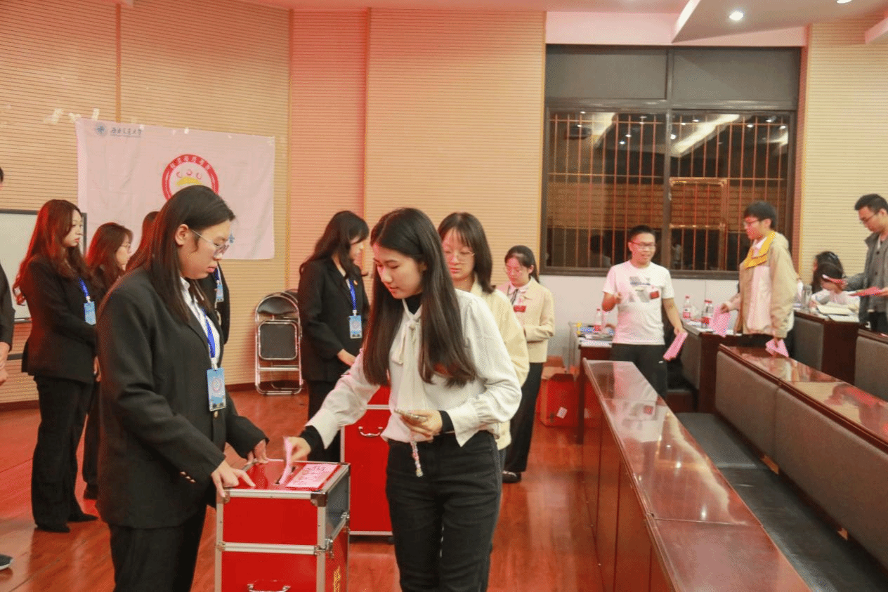 接着全体代表在主会场中展开了第二次全体会议并审议通过了《关于2023-2024届员工会工作报告的决议》《关于2023-2024届研究生会工作报告的决议》,匿名投票选举了新一届员工会和研究生会主席团成员,并于现场宣布了大会的选举结果。