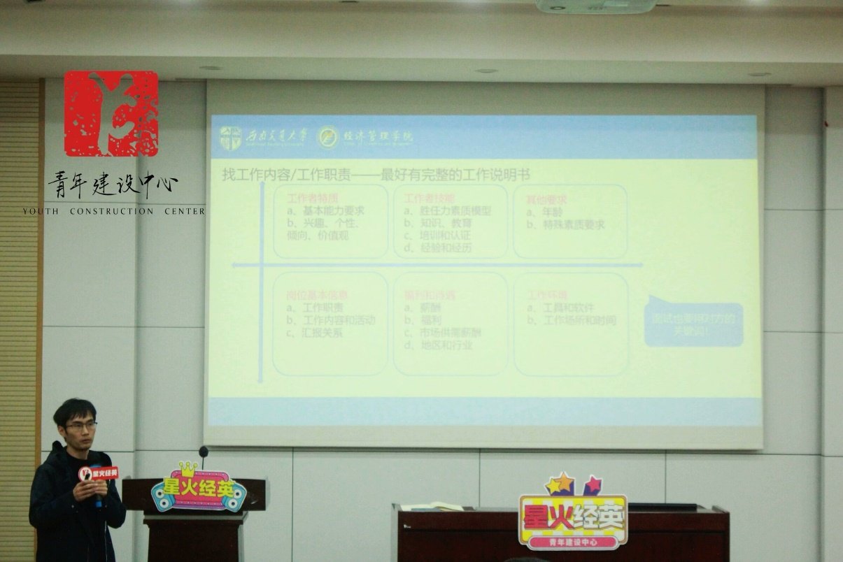 2024年11月21日晚,“星火经英”计划第十四期第六次团干部培训于J0215顺利开展,本次培训由beats365官方网站青年讲师团成员、beats365本科2023级辅导员苏扬老师主讲,主题为“企业面试与技能培训”,旨在帮助团干部们掌握面试技巧,提升就业能力。