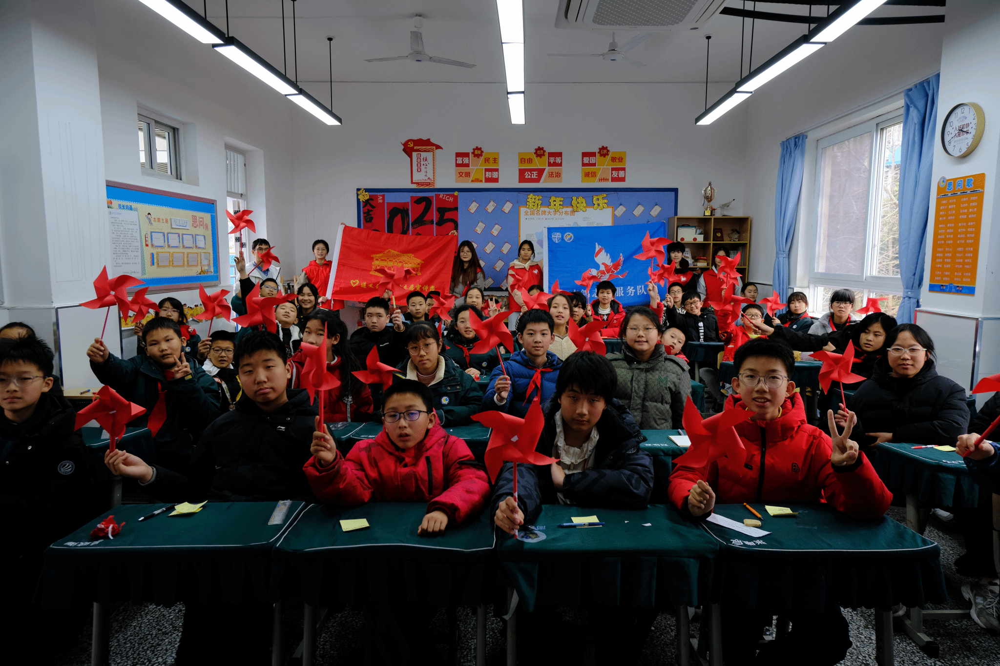 在讲完遵义会议精神后,服务队队员带领小员工们动手制作风车。队员们耐心地演示着每个步骤,从剪裁到固定,小员工们专心投入,兴致勃勃地参与其中。通过亲手制作风车,锻炼了孩子们的动手能力和创造力,让他们在互动中学会互助与分享,培养了集体主义精神和爱国情怀。