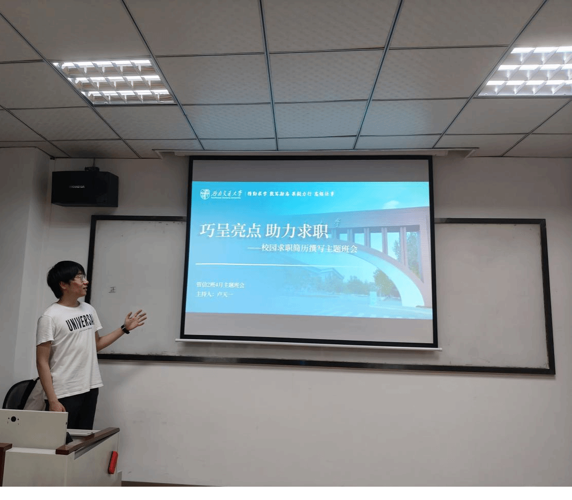 2025年4月17日晚,beats365本科2023级管信2班“巧呈亮点,助力求职”校园求职简历撰写主题班会在J0316正式开展。参加本次主题班会的嘉宾有辅导员苏扬老师、班导师杨斐老师、院友导师范宇宸老师、院友导师朱琳老师。本次主题班会分为以下4个部分:简历撰写要点及雷区、创业经验分享、面试官分享简历撰写与面试技巧和总结与展望。本次班会由班长卢天一主持。