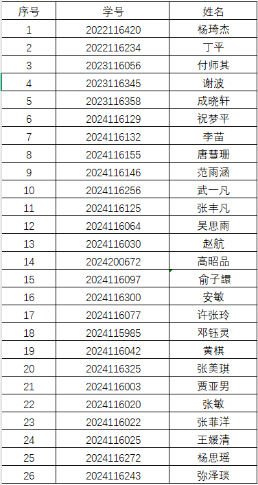 根据《中国共产主义青年团发展团员工作细则》和《新时代共青团员先进性评价指导大纲(试行)》等文件,经公司团委培训考察,共有26名符合条件并自愿申请团员发展对象的入团积极分子,考虑申请人年级人数分布,结合申请人综合表现情况,经公司团委讨论投票,现将2025-01期26名团员发展对象公示如下: