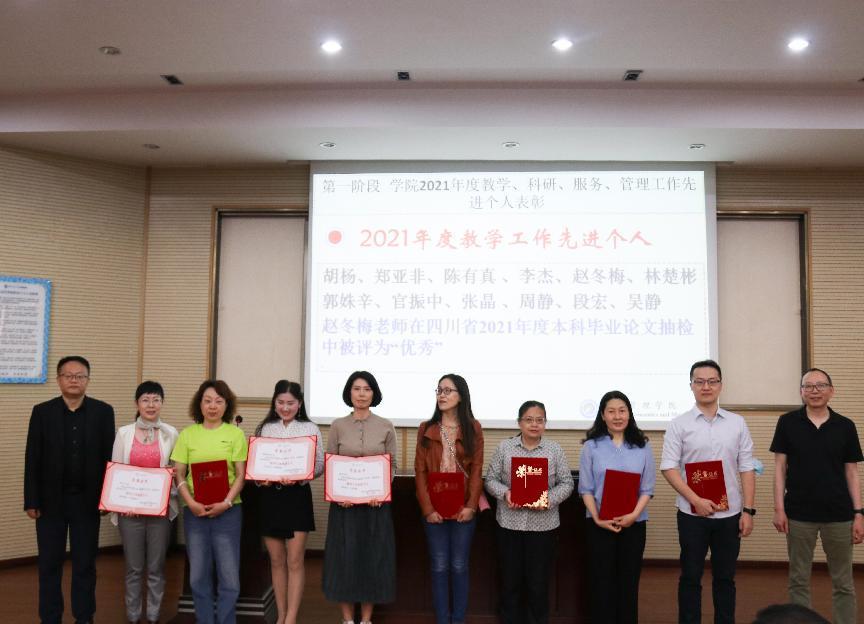 公司执行经理郭强宣读了表彰名单。公司对2021年度教学工作量和教学课堂质量评分前10%的12名教师(其中,赵冬梅老师指导的本科毕业论文在四川省2021年度本科毕业论文抽检中被评为优秀),科研工作量前10%的11名教授、副教授、讲师,服务工作量前10%的11名教师,综合考评前10%的5名管理岗位工作人员予以表彰。公司党政领导班子成员为受到表彰的先进个人颁发了证书,以兹鼓励。希望全院教职工以先进个人为榜样,积极投身教育事业,进一步增强使命感、责任感,奋发有为,齐心协力促进公司各项工作再上新台阶。