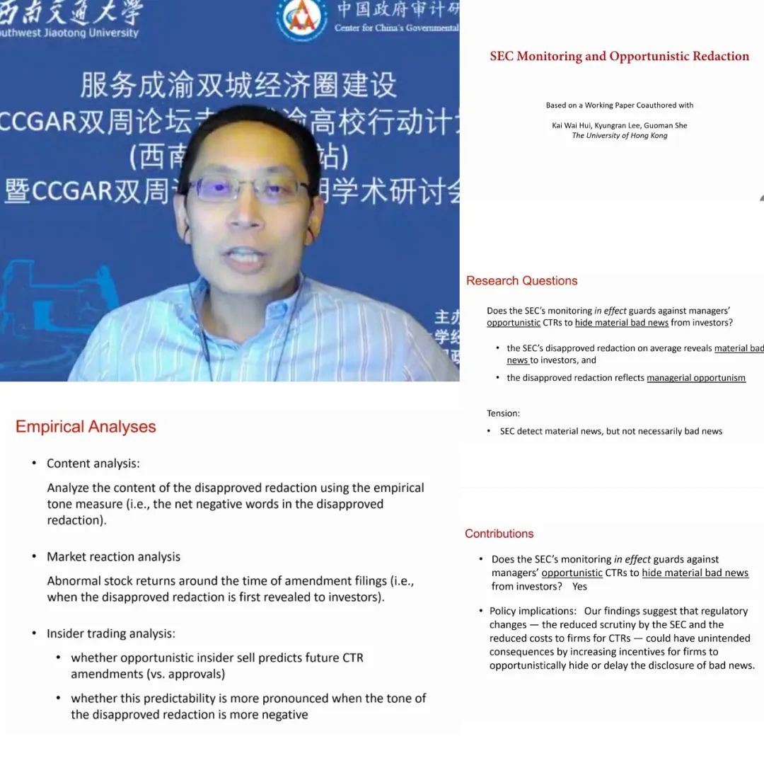 杨平教授作了题为“SEC monitoring and confidential treatment requests”的主题报告。他首先介绍了美国证监会对某些上市公司提出的保密申请做出的处理,并提出其中较大的问题是如何鉴别这个保密请求是出于商业机密还是不想披露不利消息。SEC在2018年及之前是根据保密信息的重大程度和对公司经营的机密程度对公司提出的保密申请进行审批,2019年之后调整为事后追责,杨教授认为这将鼓励公司管理者通过保密要求隐藏重大不利消息的投机动机。杨教授的研究主要做了三个方面的工作,第一是对公司财报中隐藏后又披露了的内容进行文本分析,发现其中大部分是负面消息;第二是分析曾经加密过的内容重新公布时的市场反应,发现披露前后10天内的平均累计收益率为负,并且验证了市场反应和公告有一定的相关性;第三是分析财报有隐藏内容时是否存在内部交易,发现在隐藏内容为负面信息时,公司高管有较大可能会在做出申请的三个月内卖出股票。杨教授总结,SEC驳回公司保密申请,要求必须披露的内容大概率是坏消息,通过内部人的异常交易分析看到没有被驳回的公司则大部分没有问题,2019年制度修改后可能会延长坏消息传导到市场的时间。