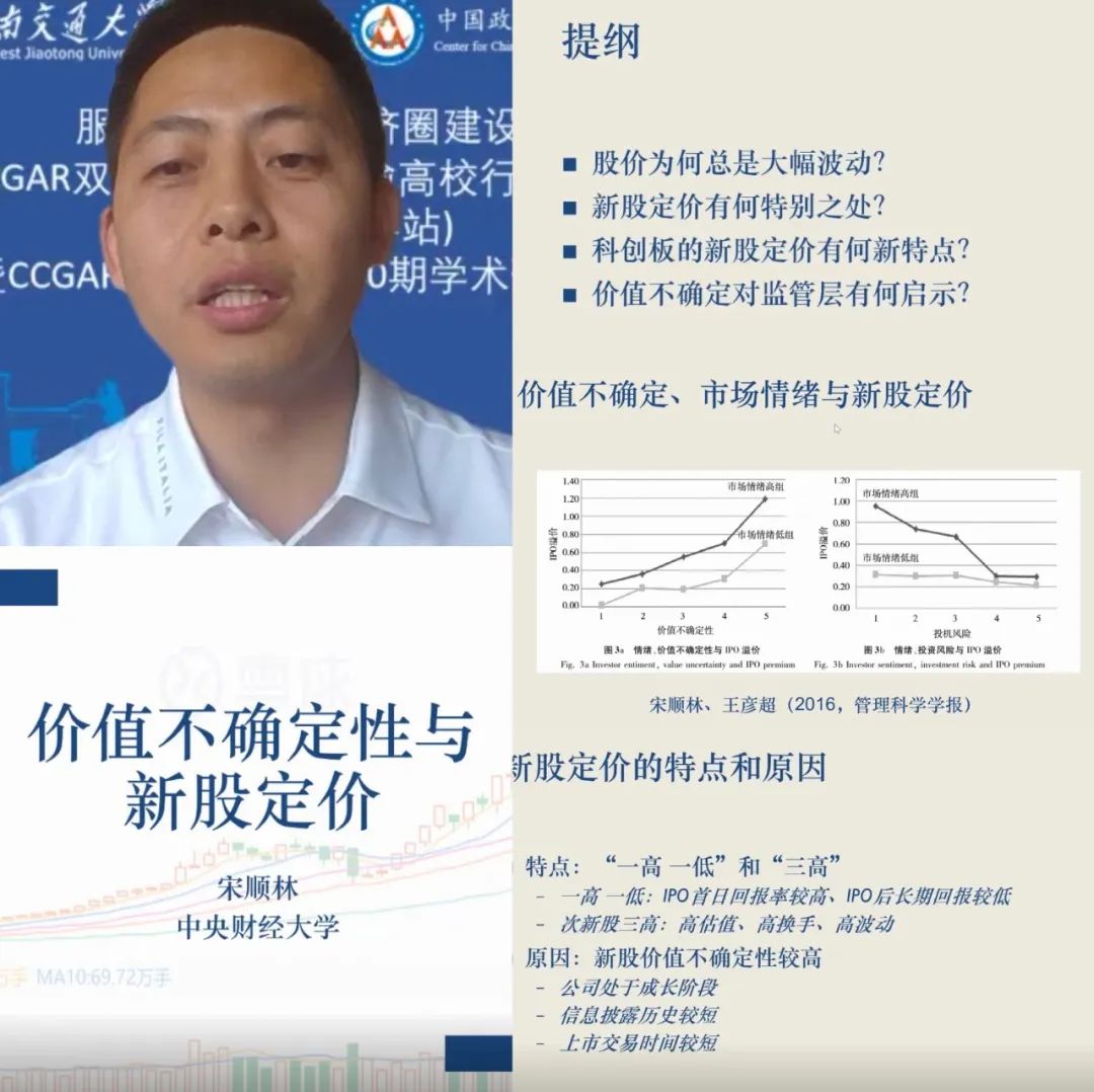 宋顺林教授作了题为“价值不确定性理论与科创板新股定价” 的主题报告。宋教授指出,过往研究表明股票价格的波动有时候很难用有效市场假说去解释,但比较符合行为金融中的投资者情绪理论。他通过研究发现,股价波动的根本原因不是投资者情绪,而是公司价值的不确定性。公司的价值不确定,投资者在不同阶段就会产生不同预期,且预期具有短期的不可证伪性,因此投资者情绪会影响股价。宋教授介绍了价值不确定性对新股定价的影响。新股定价的特点是一高一低,首日的回报率高而长期(上市前三年)的回报率低;次新股则具有高估值、高换手、高波动的三高特点。他认为新股高度的价值不确定性影响了股票定价,中国IPO首日回报率的主要原因就是二级市场对新股价格的高估。宋教授也研究了一级和二级市场的价格管制对新股定价的影响,发现价格管制使得发行价和发行后的交易价格失去了传递价值信号的功能,进一步加大了新股的价值不确定性,使得投资者更可能去炒作公司,推高股价;科创板新股由于其自身特点具有更高的价值不确定性。宋教授认为这个研究对监管层有几点启示:打击次新股恶性操纵、容忍合法的新股投机、消除影响企业价值不确定性释放的管制、助推削弱价值不确定性的投资生态、包容新股破发行为。