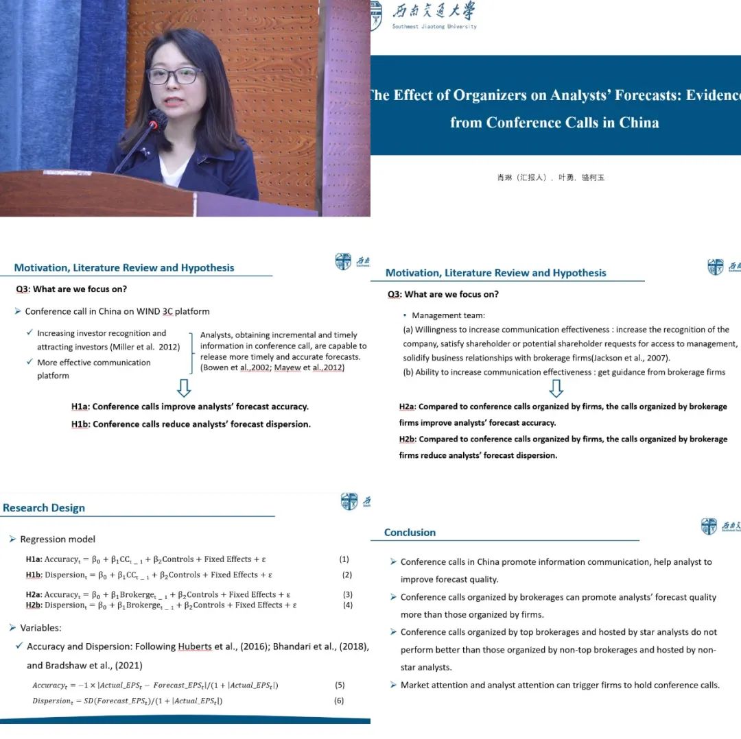 博士研究生肖琳作了题为“The Effect of Organizers on Analysts’Forecasts: Evidence from Conference Calls in China”的工作论文报告。她以万得电话会议为研究对象,研究了两个方面的问题:一是电话会议能否提高分析师的盈余质量,包括能否提高预测的准确度和降低预测的离散度;二是分析主办方的不同是否带来分析结果的差异。文章以2015-2019年万得电话会议数据为研究样本,研究结果验证了两个假设。进一步研究发现,主办方是头部还是非头部券商,主持人是否是明星分析师对分析师的预测结果影响不显著。