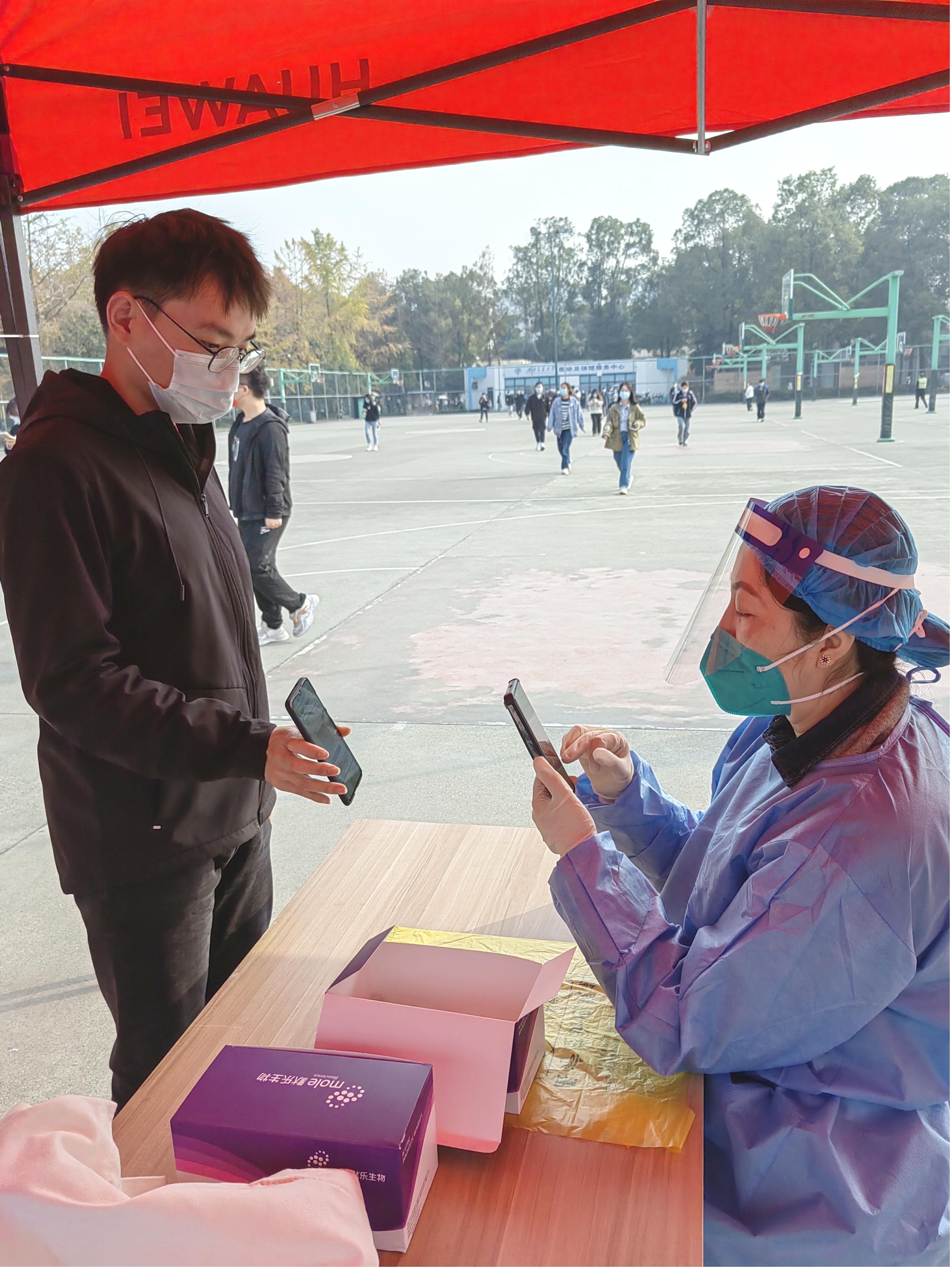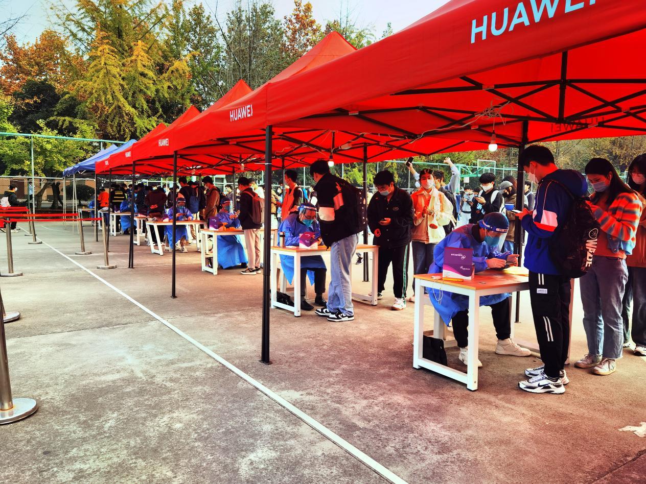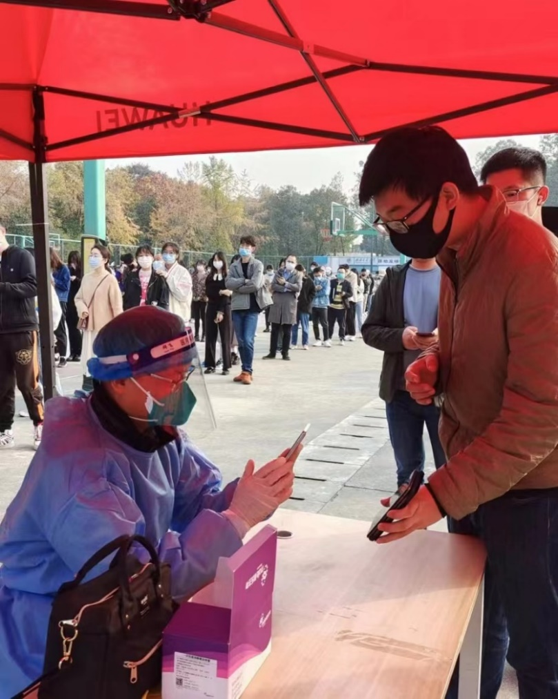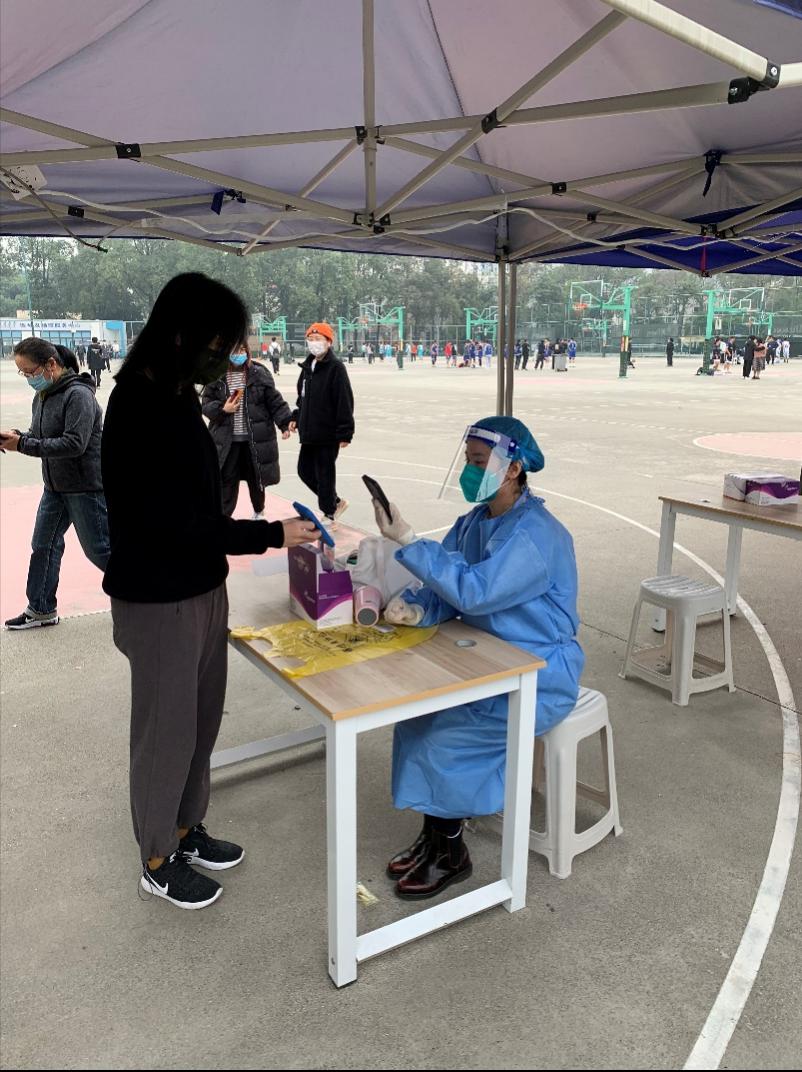 早上8点,九里校区核酸检测工作准时开始。公司13位志愿者老师们严格按照防疫要求,尽职、细致地为参与核酸检测的师生进行信息扫码录入工作。现场不一会儿就排队如长龙,面对许多参检者天府健康通打不开、健康码无法显示的突发异常情况,公司志愿者老师们耐心指导大家出示个人身份证,或对没有带身份证的人员现场一对一单独录入数据参加核酸检测。在志愿者、医务人员和广大师生的共同努力下,全员奋战5个小时,圆满完成了11月24日九里校区逾万人的核酸检测工作。