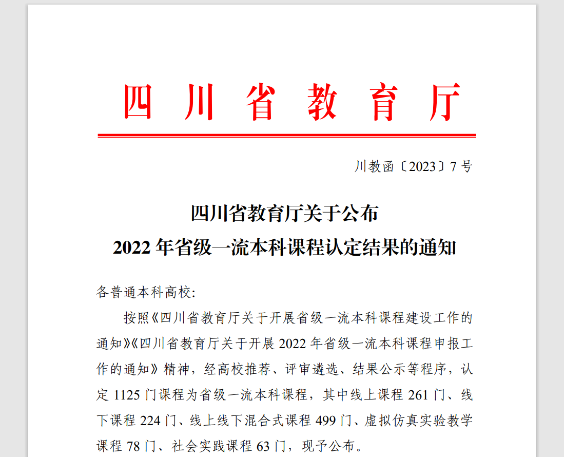 近日,四川省教育厅公布了《四川省教育厅关于公布2022年省级一流本科课程认定结果的通知》(川教函〔2023〕7号),公司3门课程获得省级一流课程认定,分别是郭强教授的《生产管理学》、蒋玉石教授的《市场营销学》、周奇志老师的《管理会计学》。