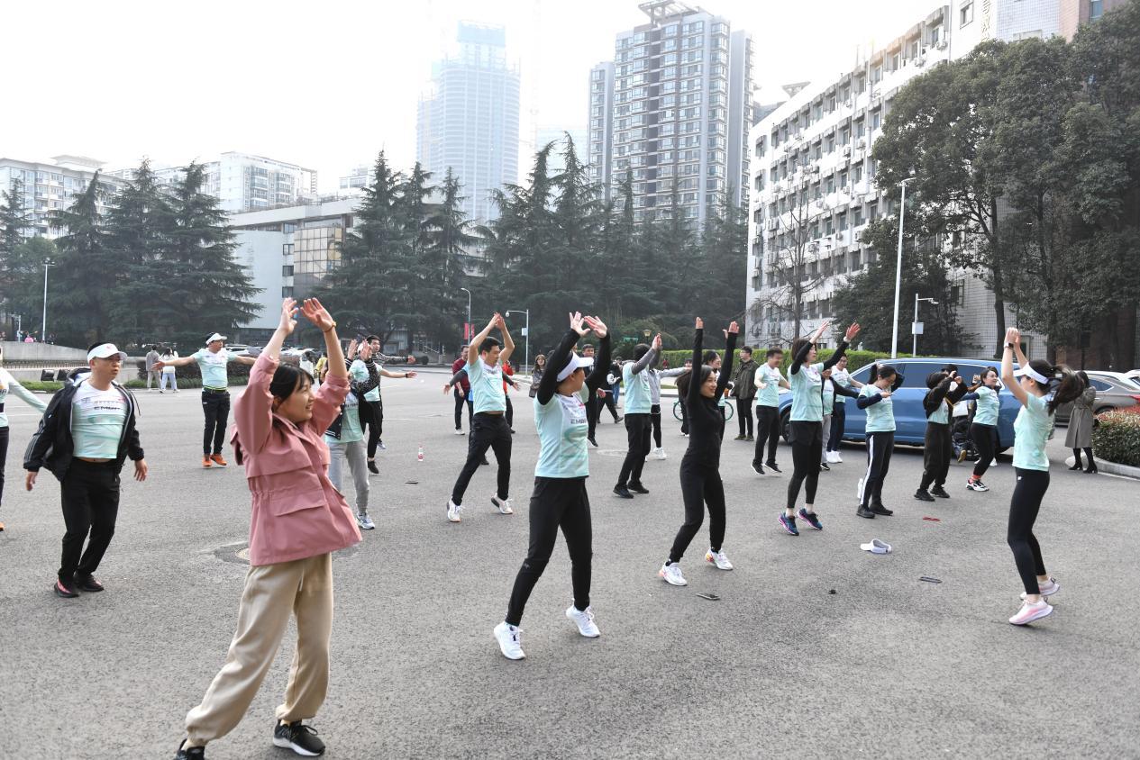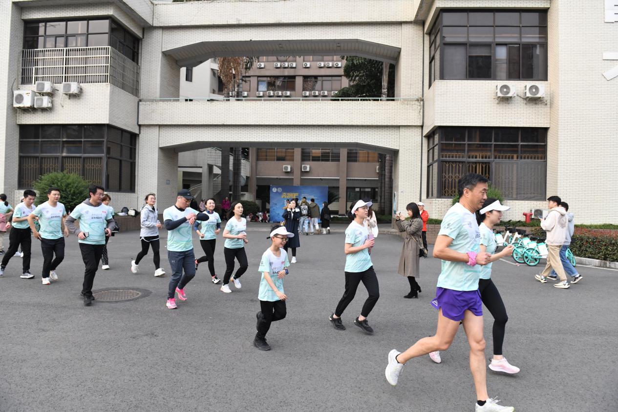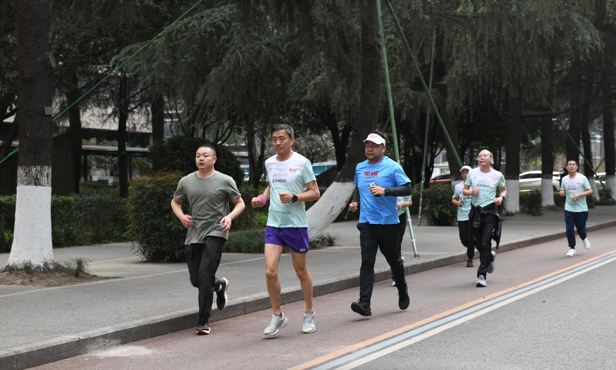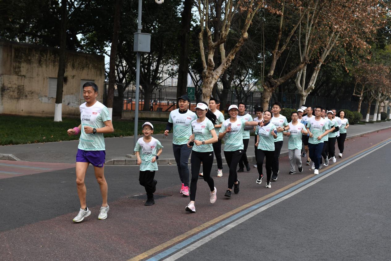 启动会毕,由专业教练带领进行热身活动之后,师生员工们身着EMBA戈赛运动服从0号楼出发,踏上平时熟悉的一寸寸校园土地,浩浩荡荡的队伍犹如一条长龙穿梭在校园,形成一道亮丽的风景线。师生员工们途经逸夫馆、运动场、镜湖,沿着唐臣路,最终返回0号楼顺利跑完全程。短短2公里的健康跑,代表的是对EMBA员工会戈友会俱乐部的传承,迈出奋发的步履,奔向更好的明天。