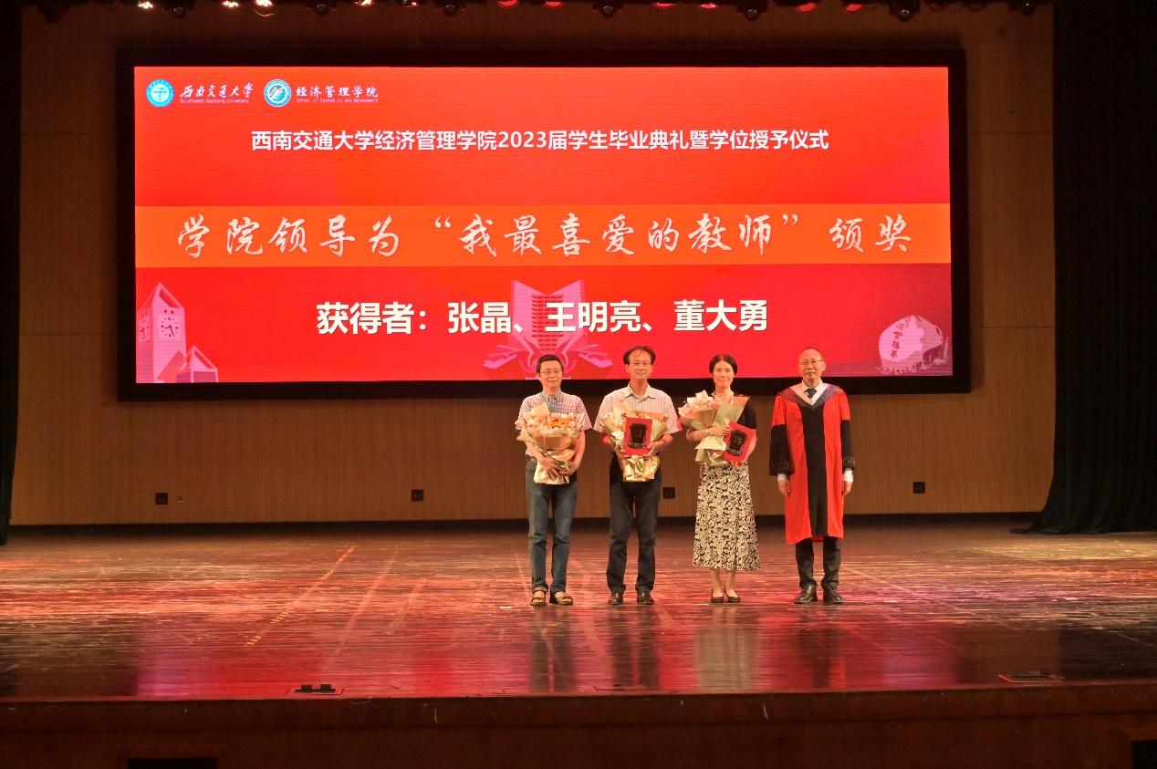 公司副经理李良宣读公司2023届本科毕业生评选的“我最喜爱的教师”名单,获得者是:张晶老师、王明亮老师、董大勇老师,并由王明亮老师作为教师代表为2023届毕业生致临别寄语。他在发言中,回顾了与同学们共同走过的39年风风雨雨,分享了陪伴同学们成长的点点滴滴,希望同学们在将来仍要积极努力,一定要做一个对社会、对集体、对家庭有责任感的人,彰显我们交大经管新青年的大格局、大情怀、大担当。