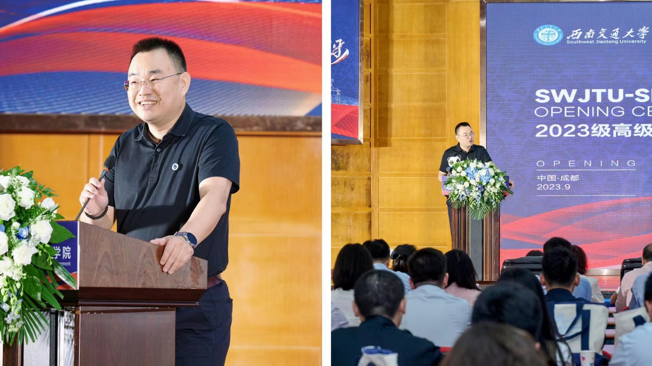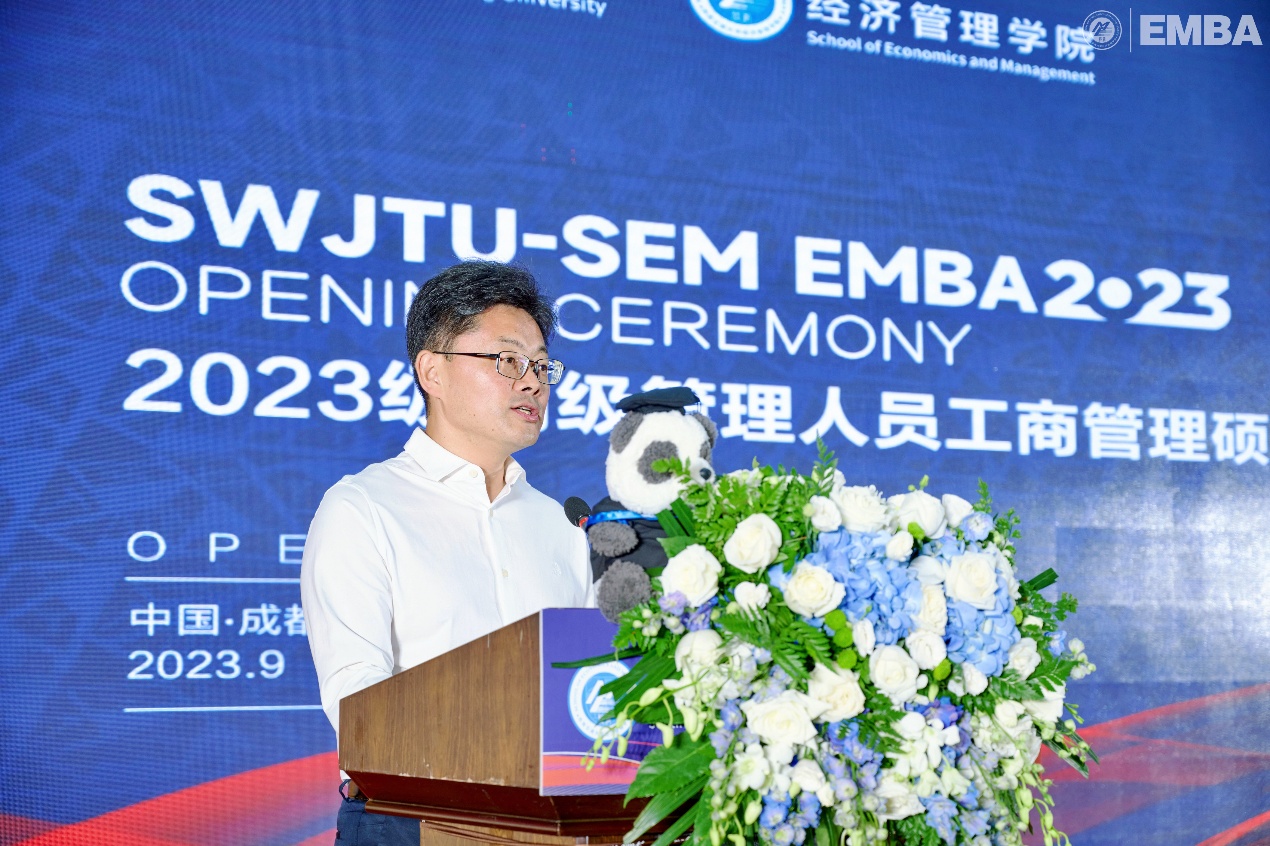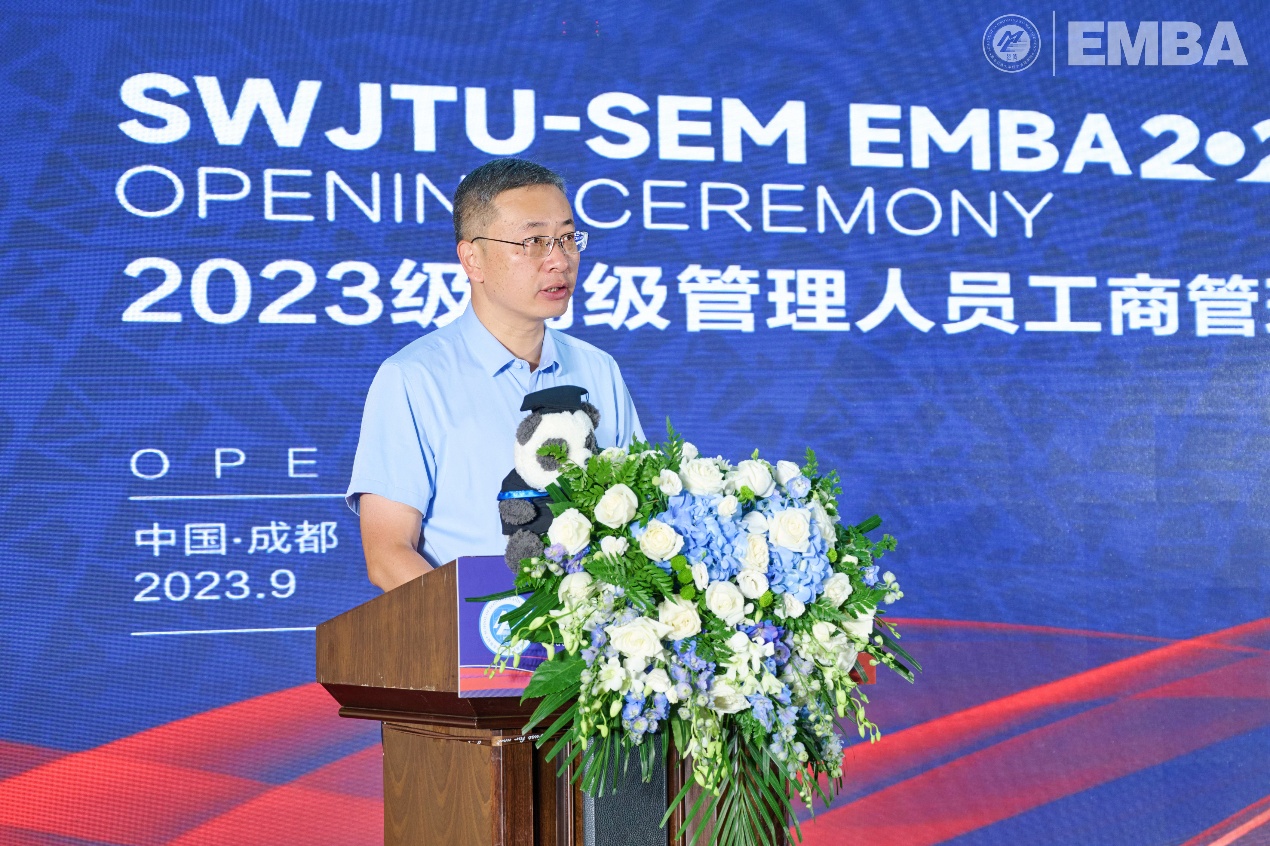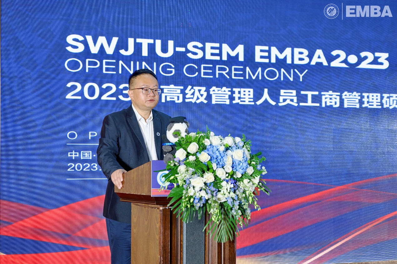 紧接着,叶竣涛先生作为EMBA员工代表发言,他回顾了自己在交大EMBA的学习经历和收获,分享了自己在职业发展和企业管理方面的感悟和经验。他鼓励新生要珍惜在交大EMBA的宝贵时光,要勇于挑战自我、不断拓展视野、强化核心能力,积极参与到员工活动中来,与交大EMBA共同成长。