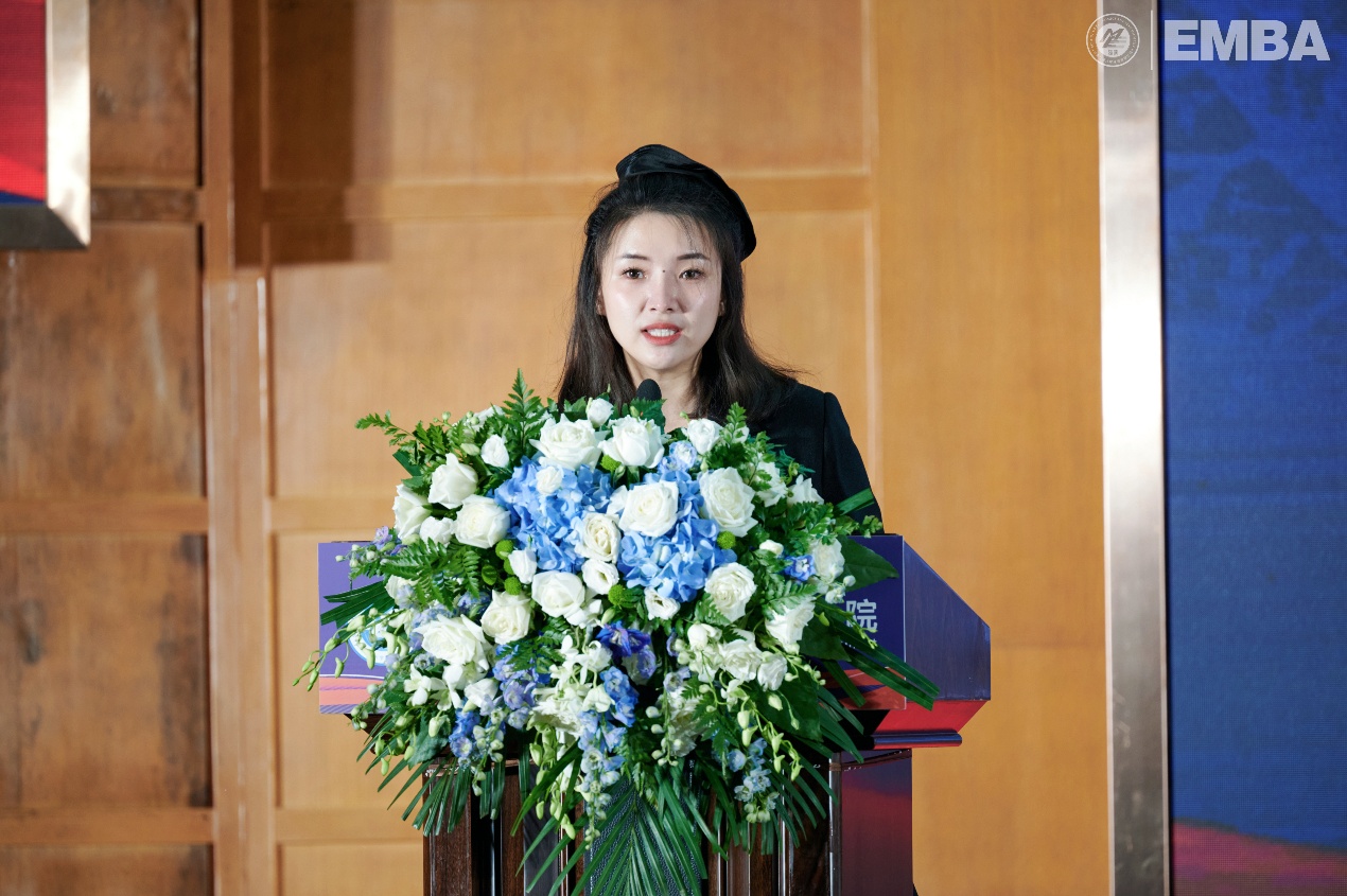 随后,曾楠女士作为EMBA新生代表发言,她代表全体新生向公司和老师表示感谢和敬意,向员工和同学表示祝福和期待。她表示,选择交大EMBA是一种荣幸和责任,是一次学习和成长的机会和挑战。她希望自己和同学们能够坚持梦想、勇于创新、互相支持、共同进步,为交大EMBA增光添彩。