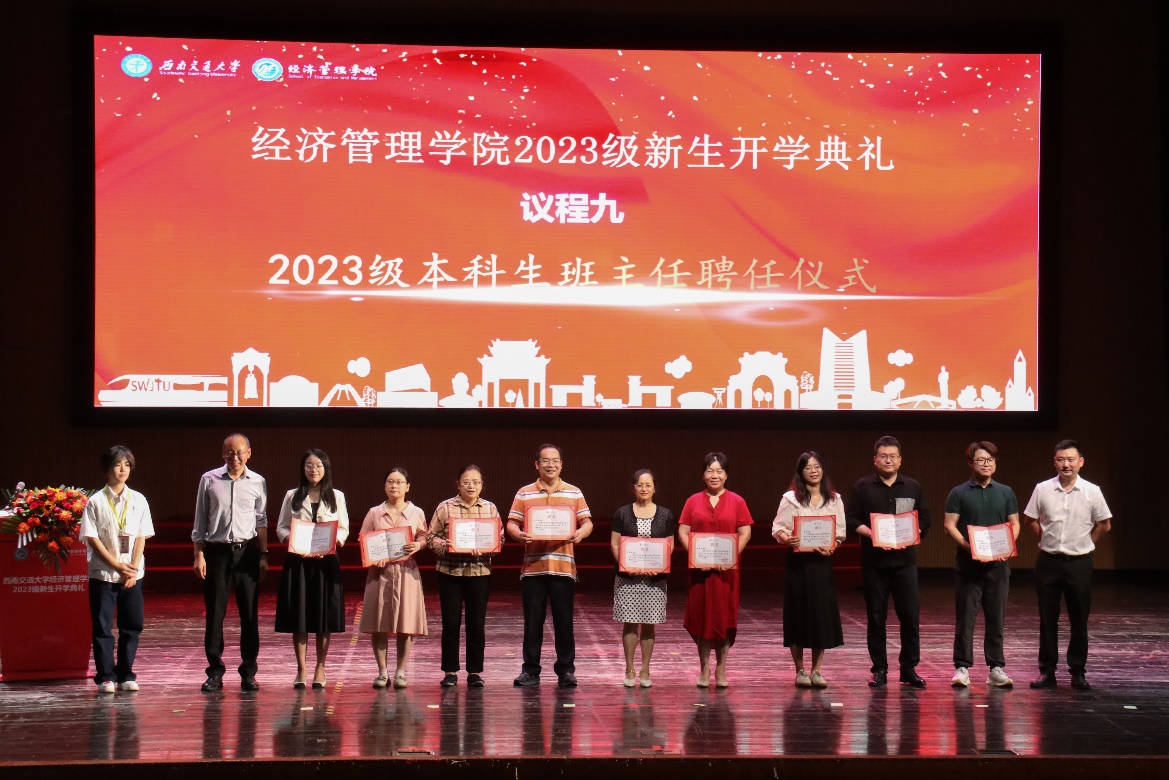 接下来进入2023级本科生班主任聘任仪式环节。在同学们热烈的掌声与尊敬的目光中,主持人介绍了本科新生十四位班主任,他们庄重地接过聘书,并一同合影留念。