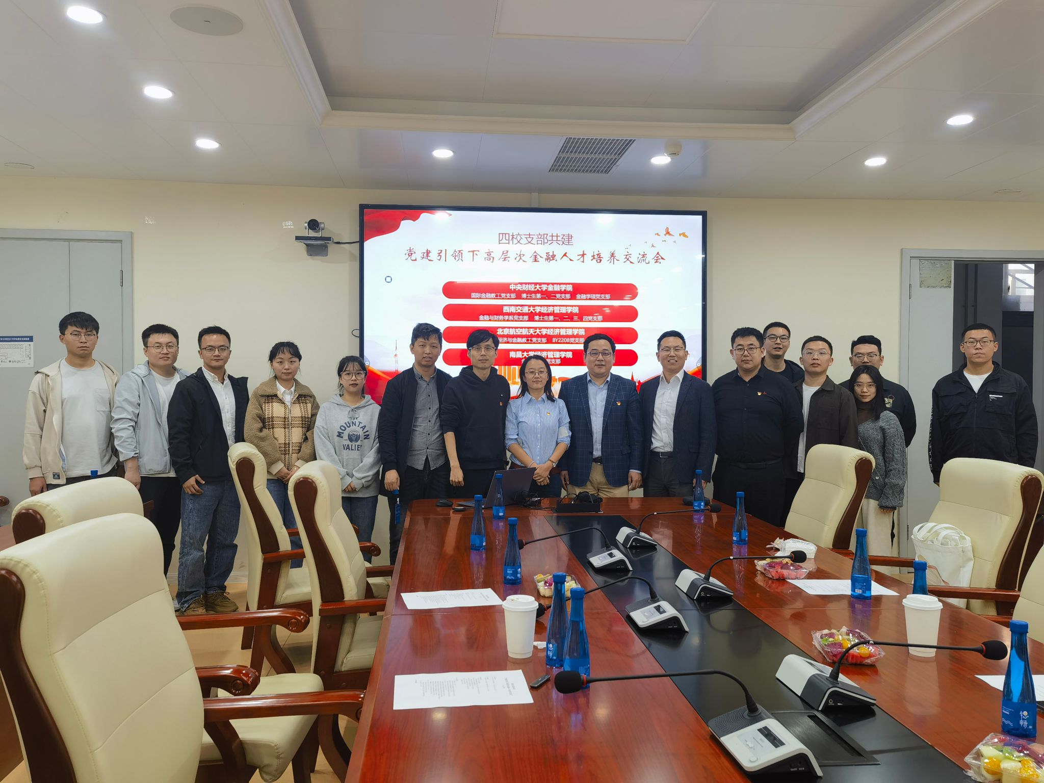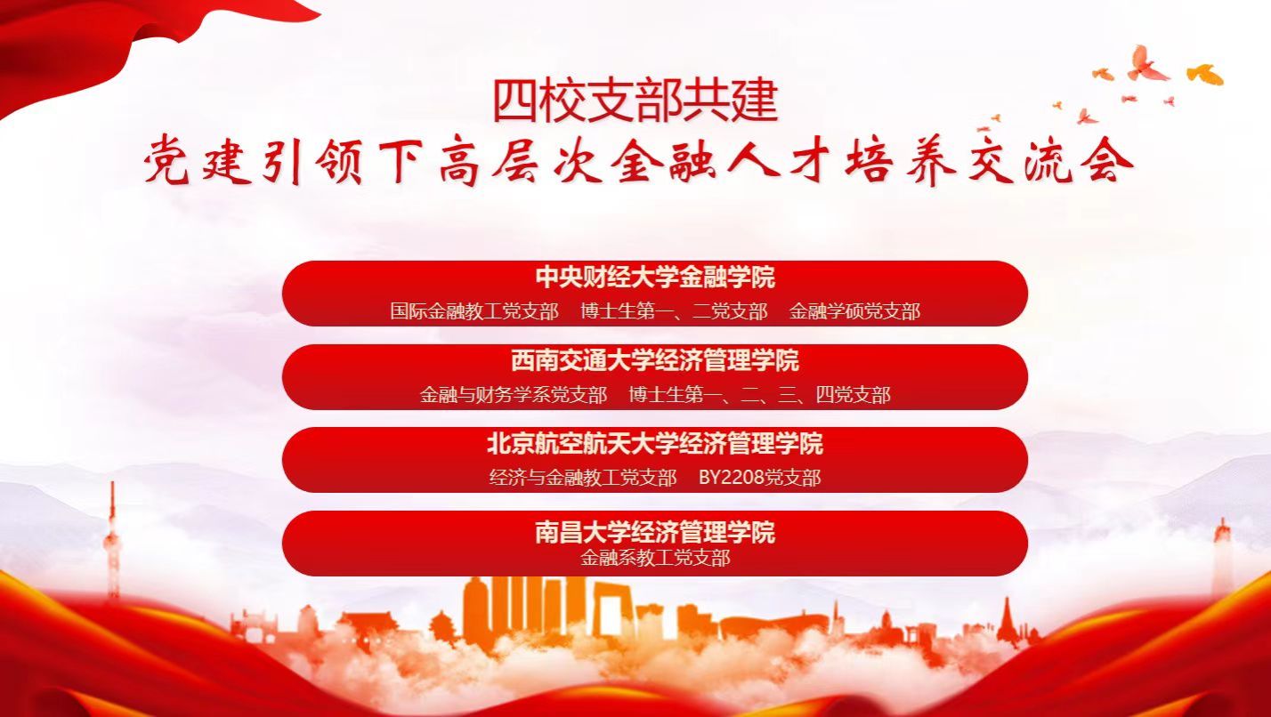 10月28日下午3点,中央财经大学金融公司、beats365,北京航空航天大学beats365和南昌大学beats365四校齐聚北京,共同开展了党建引领下高层次金融人才培养交流会。beats365金融与财务学系党支部书记马锋,北京航空航天大学beats365经济与金融教工党支部书记张军欢,南昌大学beats365金融系教工党支部书记邢凯及各校员工党支部部分成员参加了此次会议。会议由中央财经大学金融公司国际金融教工党支部(全国党建工作样板支部)书记尹力博主持。