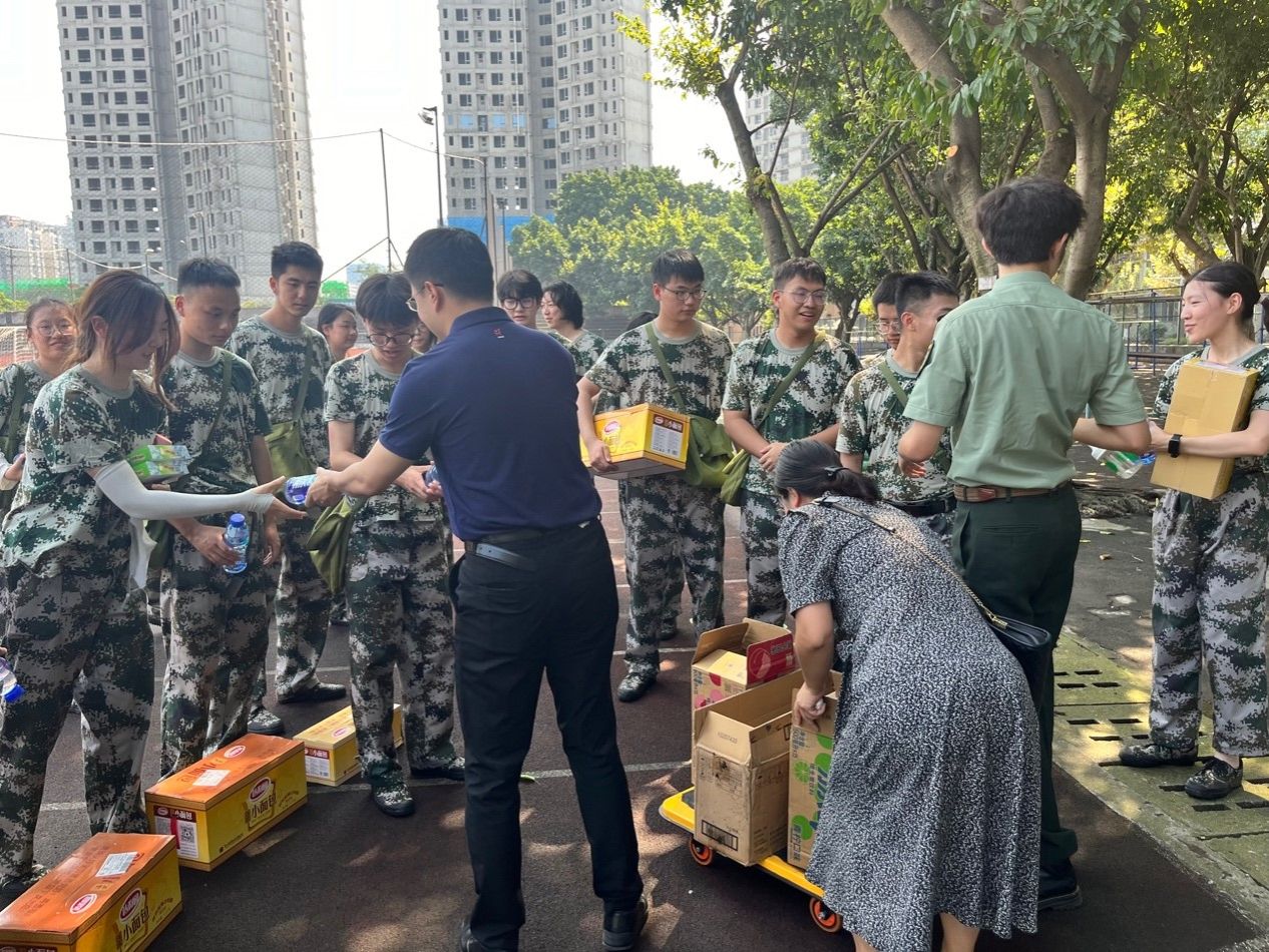 接着,公司领导为同学们送上了精心准备的慰问品。他们将小面包、士力架、冰凉贴、能量饮料等物资递给员工,叮嘱员工们要注意防暑降温,及时补充水分,保持身体健康。此外,公司还为军训员工准备了藿香正气水、花露水等保障物资。同学们纷纷表示,公司的关怀让他们倍感温暖,他们将把这份关怀转化为动力,更加努力的完成军训任务,展现经管学子的风采。