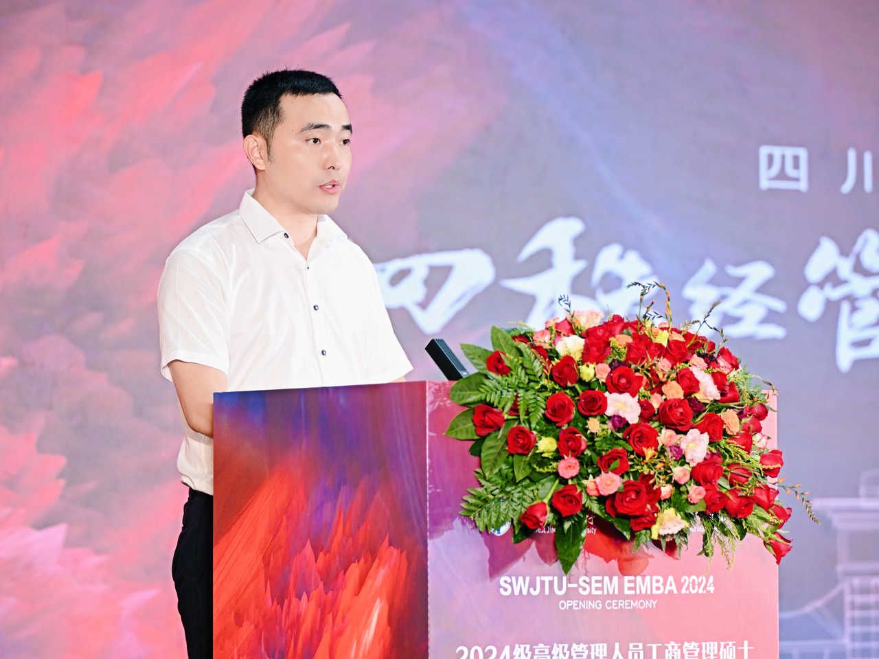 紧接着,杜敏通先生作为EMBA新生代表发言。他代表全体新生向公司和老师表示敬意和感谢,向同学表示祝福和期待。他希望同学们积极学习,不懈努力,争做杰出的企业家和管理者。通过在西南交大的学习,为社会的进步和国家的发展贡献自己的力量。
