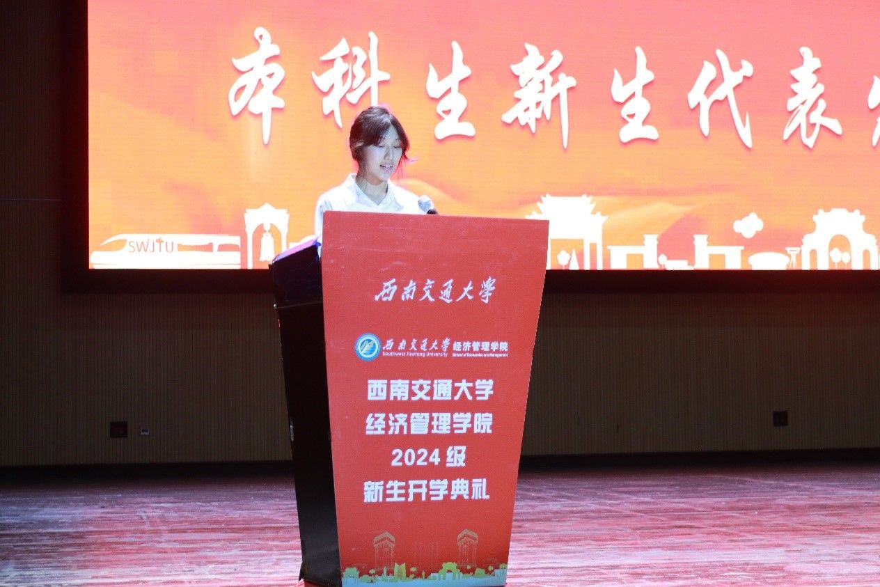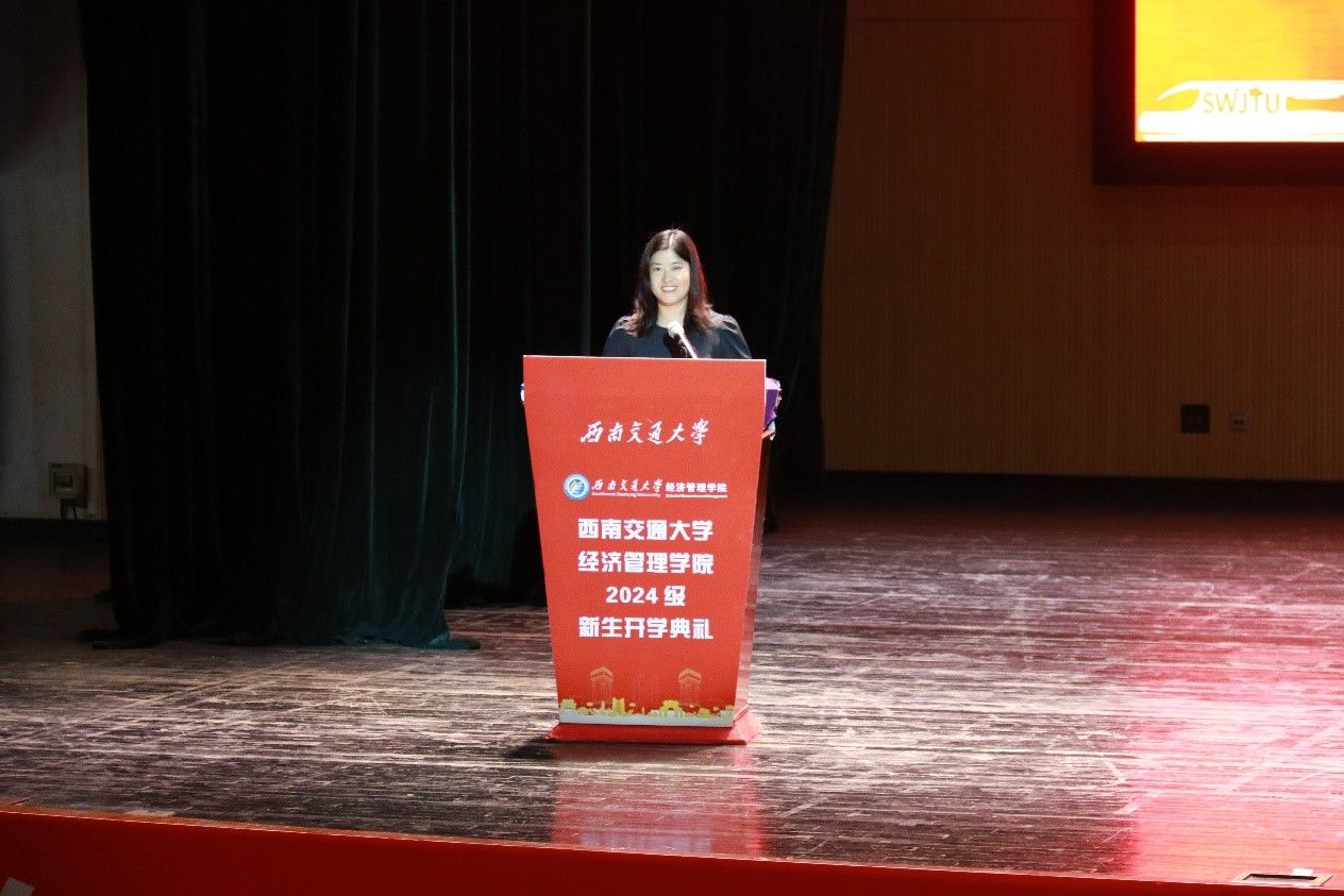 议程五,研究生新生代表王灵瑶发言。她首先向朝夕相处的师长和前辈表示衷心的感谢,给予出席开学典礼的同学们真诚祝贺。回忆起求学路上的点点滴滴,她总结到以下三点:第一,脚踏实地,汲取前行力量。在本科四年里,她于专业知识、科研活动、学科竞赛等多方面均衡发力并取得优异成绩,探索未知,收获学问;第二,究其真理,反躬以践其实。在美的集团参与暑期实习项目,亲手解决商业问题,她深深体会到了学以致用、知行合一的真谛;第三,开放心态,拓宽国际视野。她深感自豪交大经管公司在国际上取得的突破,希望吾辈不负培养,奋发图强。
