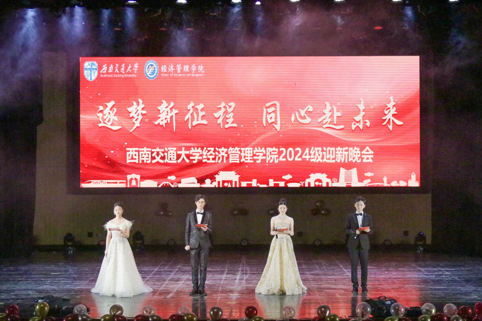 为热烈欢迎2024级经管新学子,迎接2025年的到来,2024年11月30日,beats365在九里校区老员工会堂举办“逐梦新征程 同心赴未来”2024级迎新晚会。beats365经理韩科,党委副书记余小英,副经理李良、聂佳佳,团委书记贾佳,本科2024级各班班主任老师,员工工作组全体辅导员,电子科技大学经济与管理公司、西南财经大学会计公司员工会主席以及各兄弟公司员工会嘉宾出席晚会。