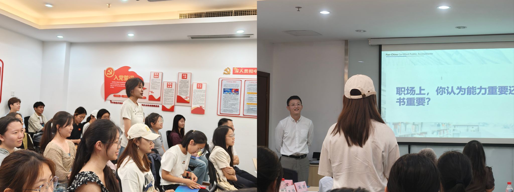 在自由交流环节,同学们围绕简历制作、职业规划等踊跃提问,现场气氛热烈。事务所从业者们结合自身经历答疑解惑,向同学们送出实用“职场指南”,希望同学们勇于探索、敢于求知,到行业与企业中尝试实操,将理论与实践紧密结合。