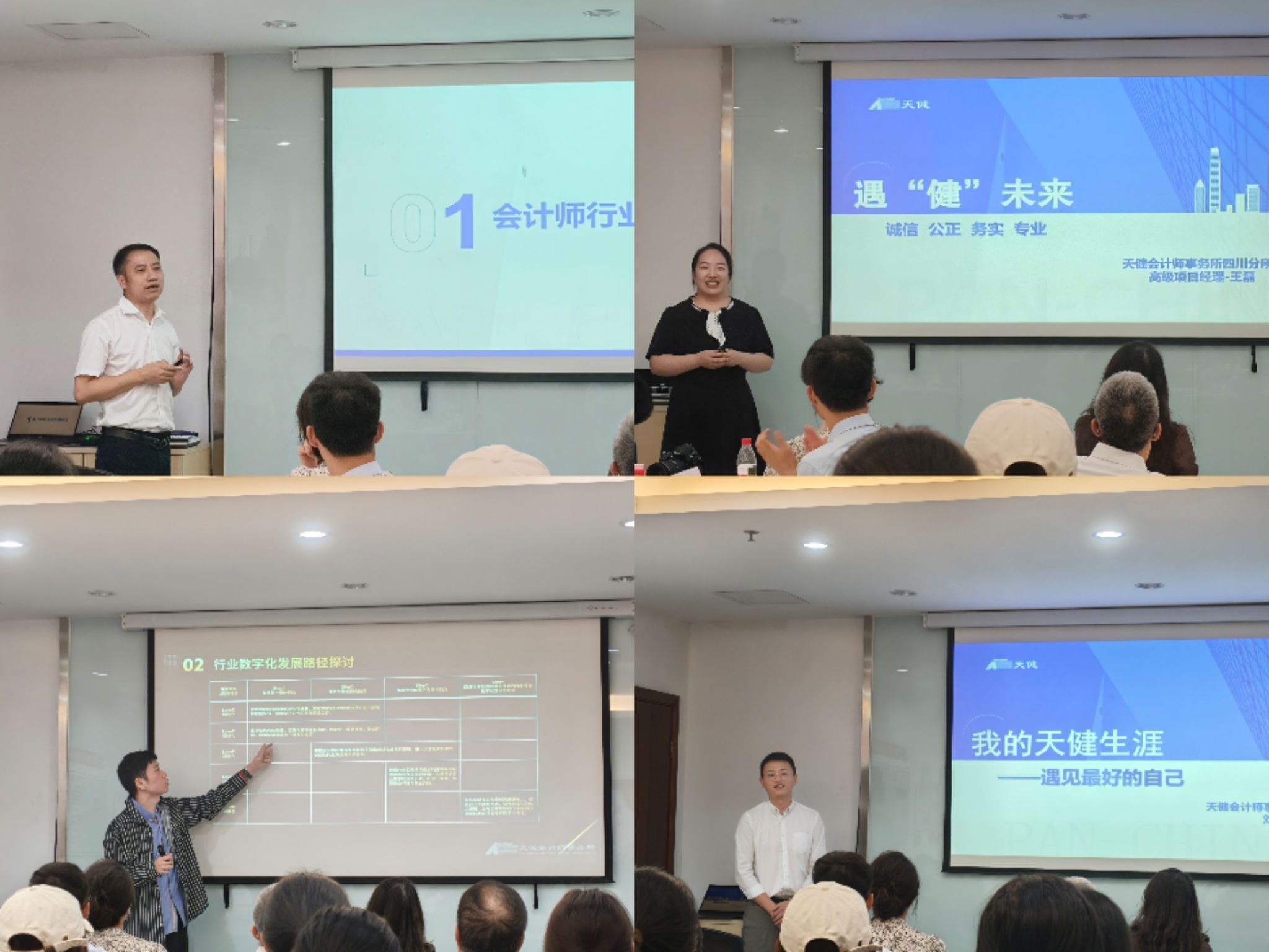 在经验分享环节,审计部合伙人李元良、项目经理王磊、部门经理刘佳鑫用活泼生动的语言,以不同职业阶段视角,分享了作为一名审计师的实战经验与成长心得,勾勒出清晰的职业发展路径。数据分析部负责人王子璇则聚焦行业数字化,解读泛资本市场与财会领域的革新方向。