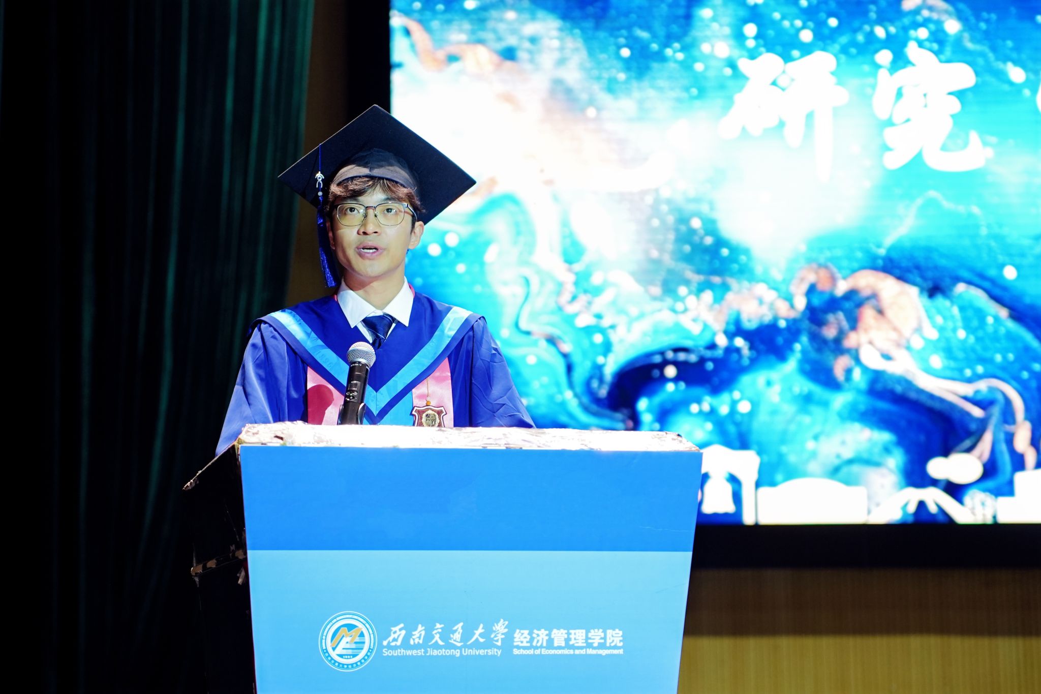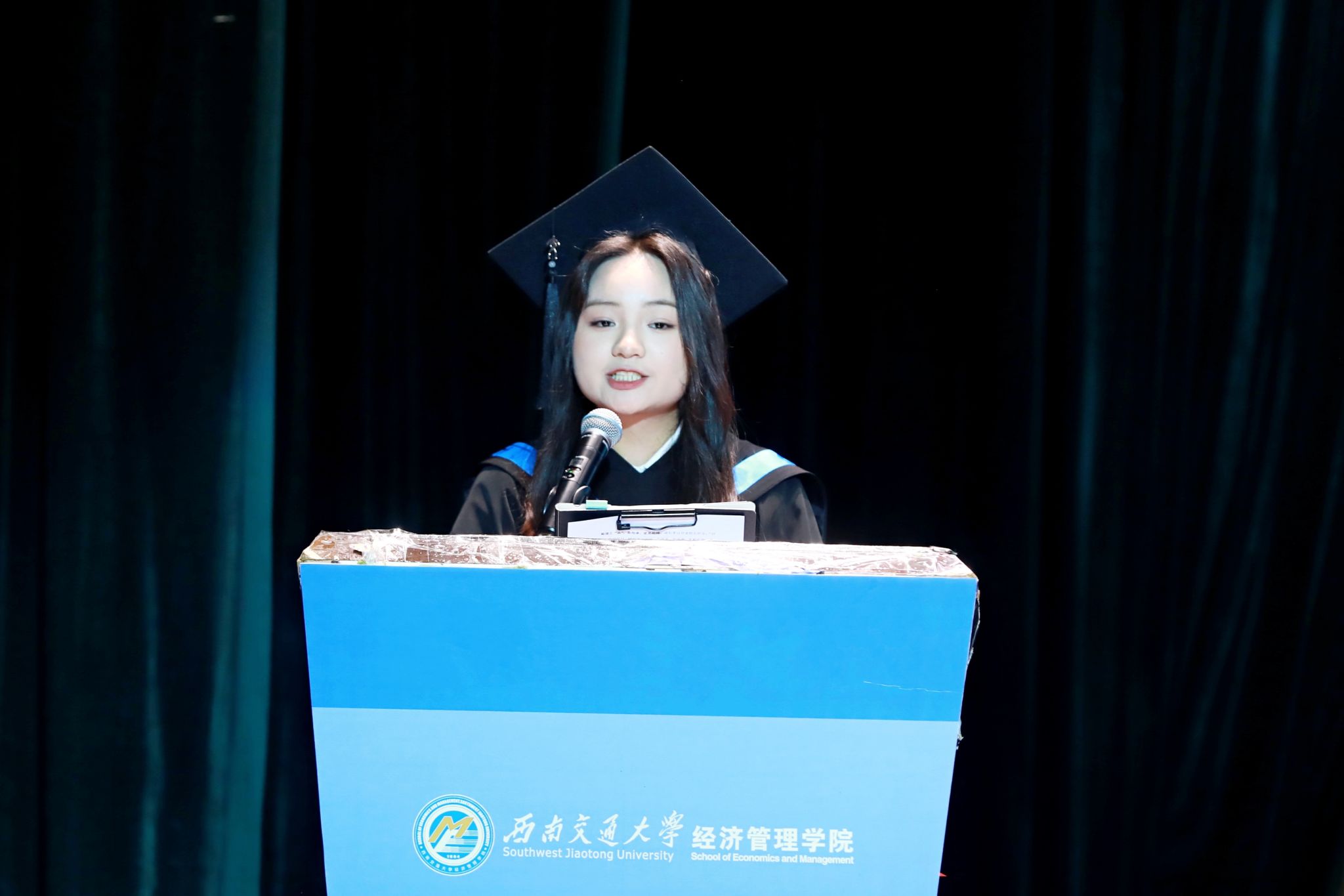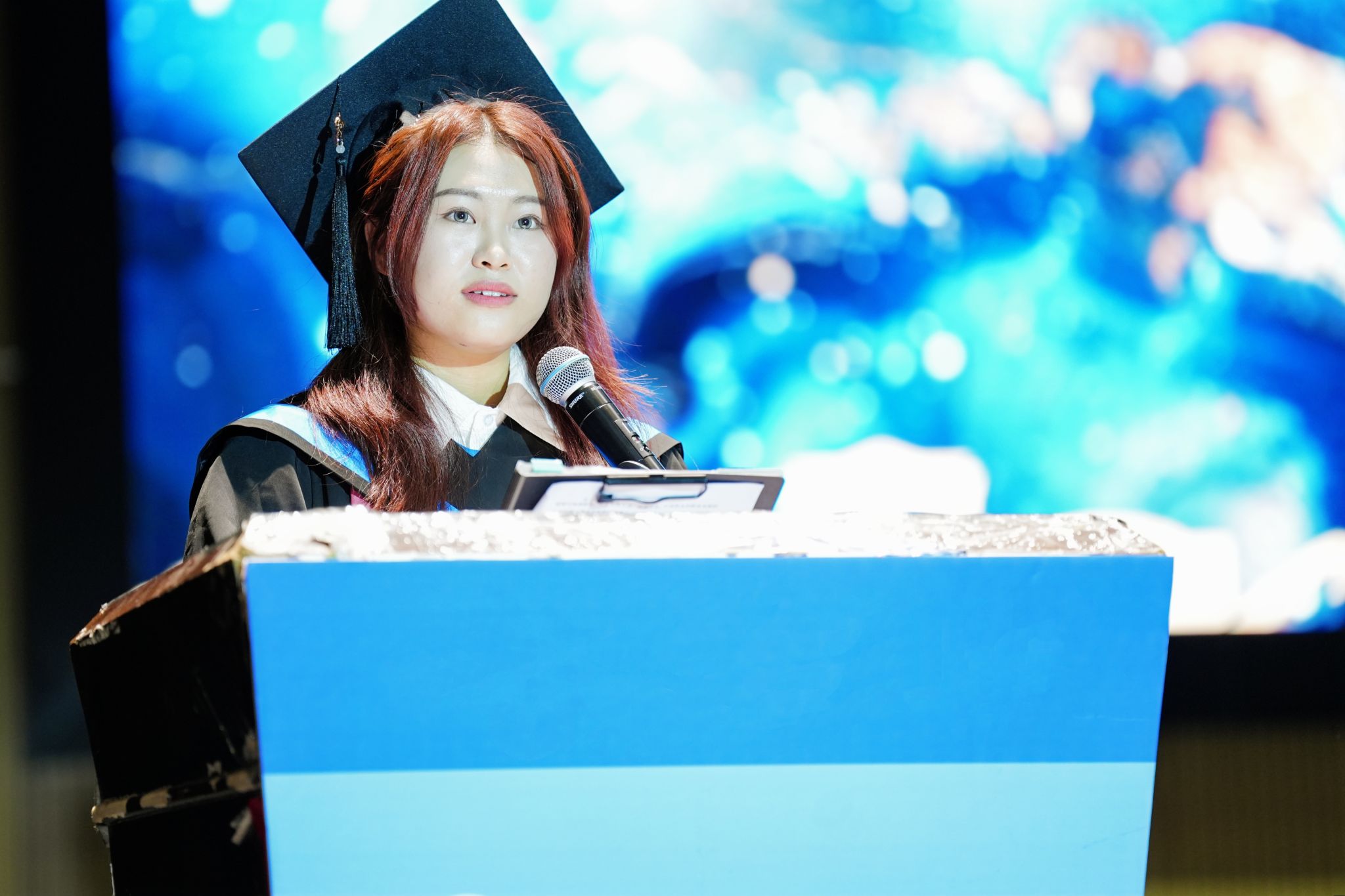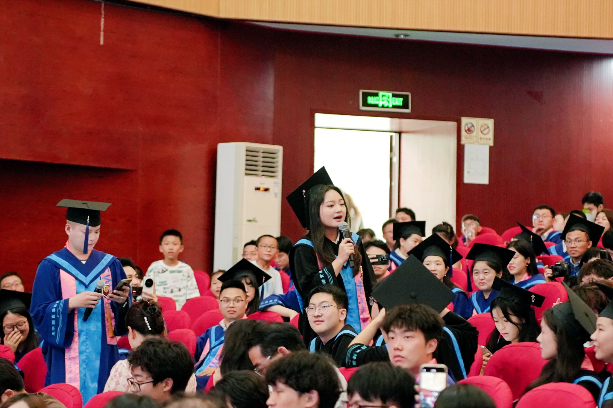 本科生毕业生代表毛宇欣、研究生毕业生代表李若晨、MBA毕业生代表张永恒分别发言。毛宇欣回顾了自己从懵懂到成熟的大学成长经历;李若晨分享了自己在硕士阶段学术研究、实践工作等方面获得的能力提升和成长;张永恒分享了自己奔走在课堂与职场之间的求学之路,不忘初心、拥抱挑战,在前行中连接彼此、照亮他人。毕业生代表真情实感的流露,饱含着对公司老师、同窗挚友的不舍与感谢。