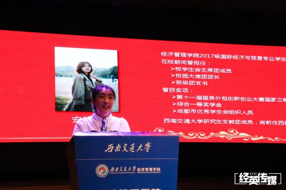 研究生支教团员工代表、2017级国际经济与贸易专业安静泽作了成长报告。她向公司和老师们表达了自己诚挚的感谢,向同学们表达了祝贺与祝福。她分享了自己的大学历程,她说:“一代人有一代人的长征路,一代人有一代人的担当,实现中华民族的伟大复兴路就是我们这一代人的长征路,走好西南交大人的长征路,要永远怀揣一颗努力奋斗的心。”