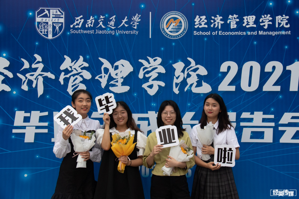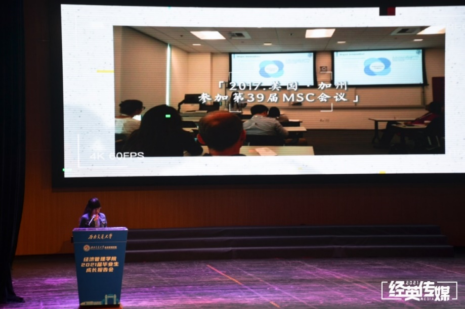 第二部分为毕业寄语,由范春宇、韦姝卉两位毕业生主持。会堂大屏幕首先播放了由2021届本科毕业生参演的纪念MV《入海》,讲述经管学子在九里校区的故事。他们走过懵懂无畏的大一,成长于意气风发的大二,成熟于淡定内敛的大三,收获于硕果累累的大四,未来也必将以梦为马,不负韶华。接着,大屏幕播放了2021届本科辅导员寄语视频。在视频中,每一位辅导员都送上了自己最美好的祝福与期许。最后,大家跟随2021届研究生纪念视频,一起步入回忆的长廊。大学的征程就像是一幅画,每一位毕业生都是这幅画的原创者,衷心祝愿每一位毕业生都将在充满期望的明天,谱写更华丽的篇章。