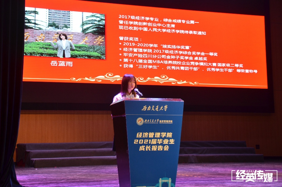 本科毕业生代表、2017级经济学专业岳蓝雨作了成长报告。她回顾了大学四年历程,表达了对公司、老师、父母及同学的感激之情,呼吁青年人应接过时代的接力棒,肩负起祖国伟大复兴的重任,用一生来践行“竢实扬华,自强不息”的交大精神。