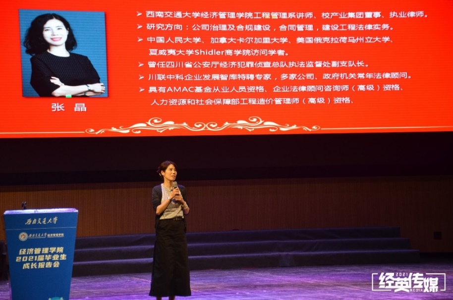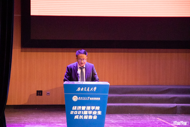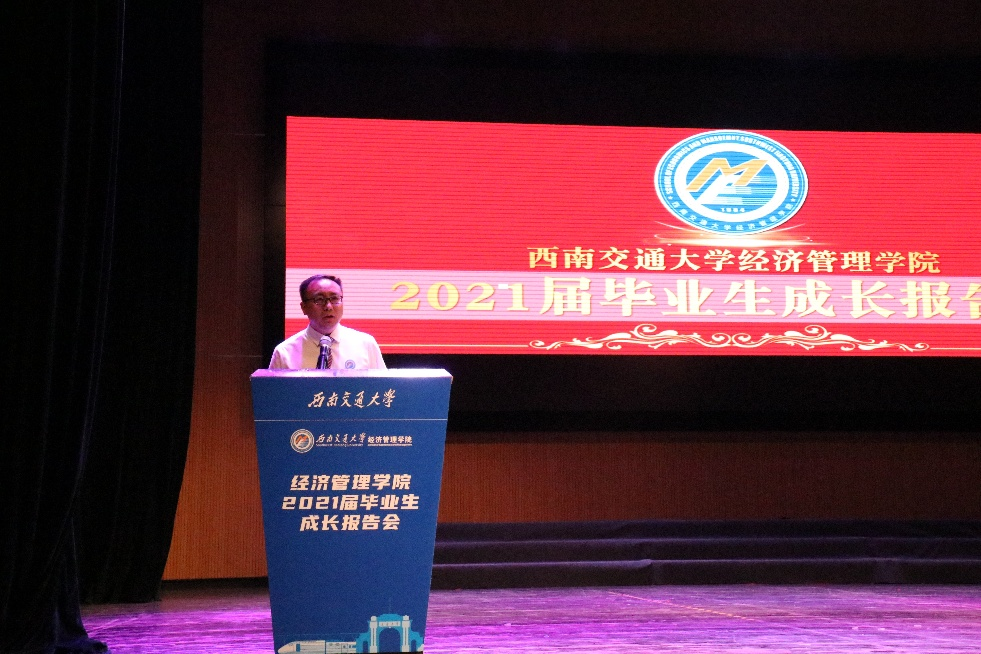 国歌奏唱完毕,执行经理郭强致辞。他首先代表在外出差的公司党委书记王斌以及公司党政领导班子对圆满完成学业的同学表示衷心祝贺,对不辞辛苦、默默付出的老师和家长表示诚挚感谢。郭强指出,此次毕业生成长报告会不仅是对过去的总结,更是对未来的展望。在中国共产党成立一百周年之际,毕业生们不仅怀揣着自己的梦想,也承载着党和国家的期许,应当肩负起复兴祖国的重任。他向毕业生们提出三点希望:一是要坚定理想信念,勤奋耕耘,不断进取,追求卓越;二是要勤于学习,勇于实践,不断提高自身素质,努力成才;三是要肩负责任,勇于担当。他强调,毕业同学们要心怀“竢实扬华,自强不息”的交大精神,传承“格物致知,和合共进”的经管院训,在崭新的未来征途中,书写更为精彩的人生篇章。
