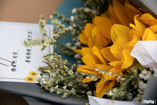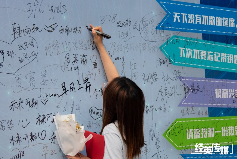 在成长报告会场外,公司还为每一位毕业学子精心准备了留言字板、带有贺卡的花束供大家纪念拍照,卡片上写有毕业生的姓名和对他的祝福。毕业生们也纷纷在留言板上签名,并写下对同学、对自己的祝福语。纵有千言万语,却也无法表达完对公司、对同窗的不舍与眷恋之情,杨柳依依,再漫长的欢聚也总有尽头,再美好的温柔也会消散,但大家对公司的这份情、对同窗的这份念永远不会消逝。