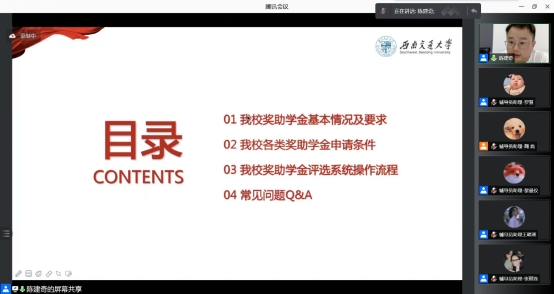 上午9点30分,在参加会议的人员到齐后,会议正式开始,陈建奇老师从奖学金评定工作筹备会的重要性展开介绍。在接下来的会议中,他向参会同学进行了新的《综合奖学金评定细则》宣讲,包括评奖要求、评奖流程和成绩计算等重要内容。同时对即将开始的评奖工作开展布置了具体安排,并在线进行了交流答疑。