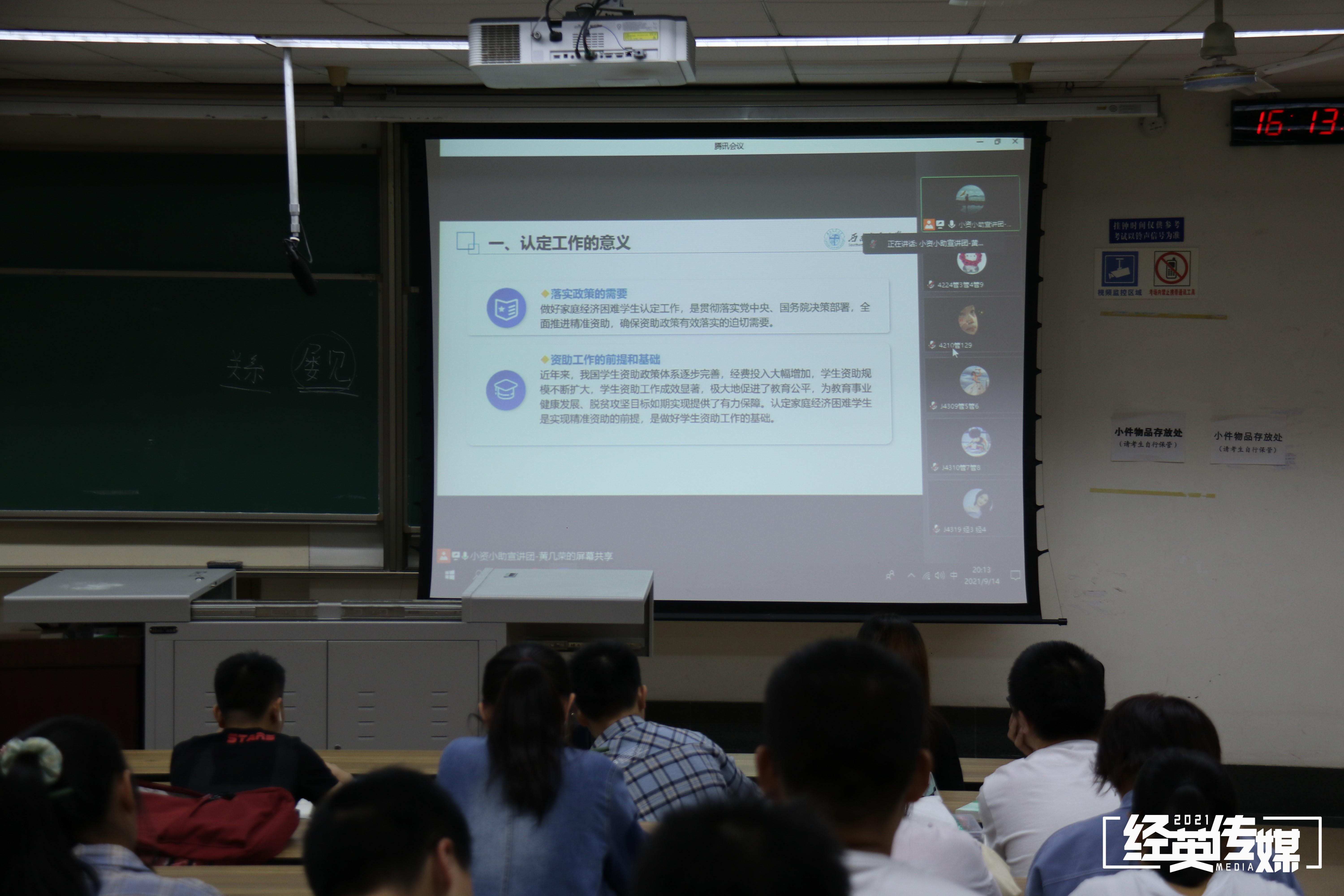 最后,黄几荣为新生们详细介绍了开展认定工作的做法,其中包括认定机构及职责、认定开展时间及准备材料、认定程序、认定管理和实地走访几个方面。