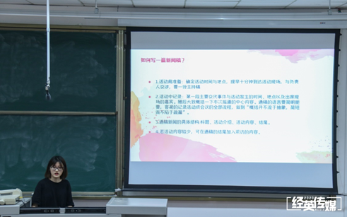 随后,由经英传媒中心采编部赵哲为同学们讲解如何写一篇规范的新闻稿。她的讲解主要分为三个部分:什么是新闻稿、如何写一篇新闻稿、如何使一篇稿件更规范。在介绍如何使一篇新闻稿更规范时,她分别从新闻写作内容、写作格式、写作注意事项为同学们带来讲解,并为同学们解释了如何在beats365院网挂稿。
