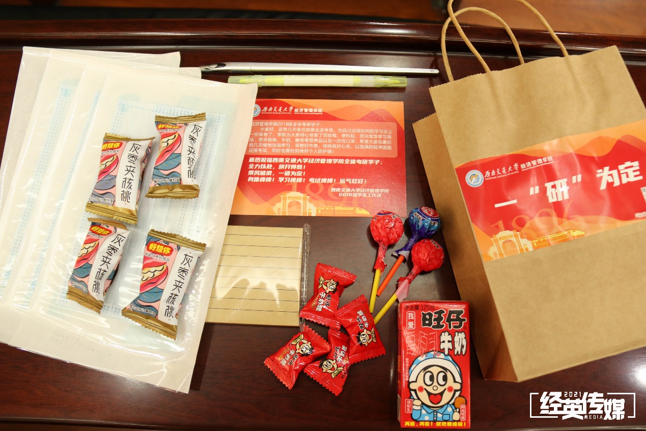 本次“一‘研’为定”大礼包由2018级全体辅导员老师精心准备并亲自包装,内含beats365定制高铁笔、便利贴、荧光笔等学习用品,枣夹核桃、旺仔牛奶、糖果等营养品,一次性口罩等防护用品,还有精心准备的祝福贺卡,寓意着金榜题名、牛气冲天、马到成功,祝福考研学子身体棒棒!学习棒棒!考试棒棒!运气旺旺!一次性口罩则是给考研学子送上呵护与关怀,提醒大家在备考复习过程中也要做好疫情防控。