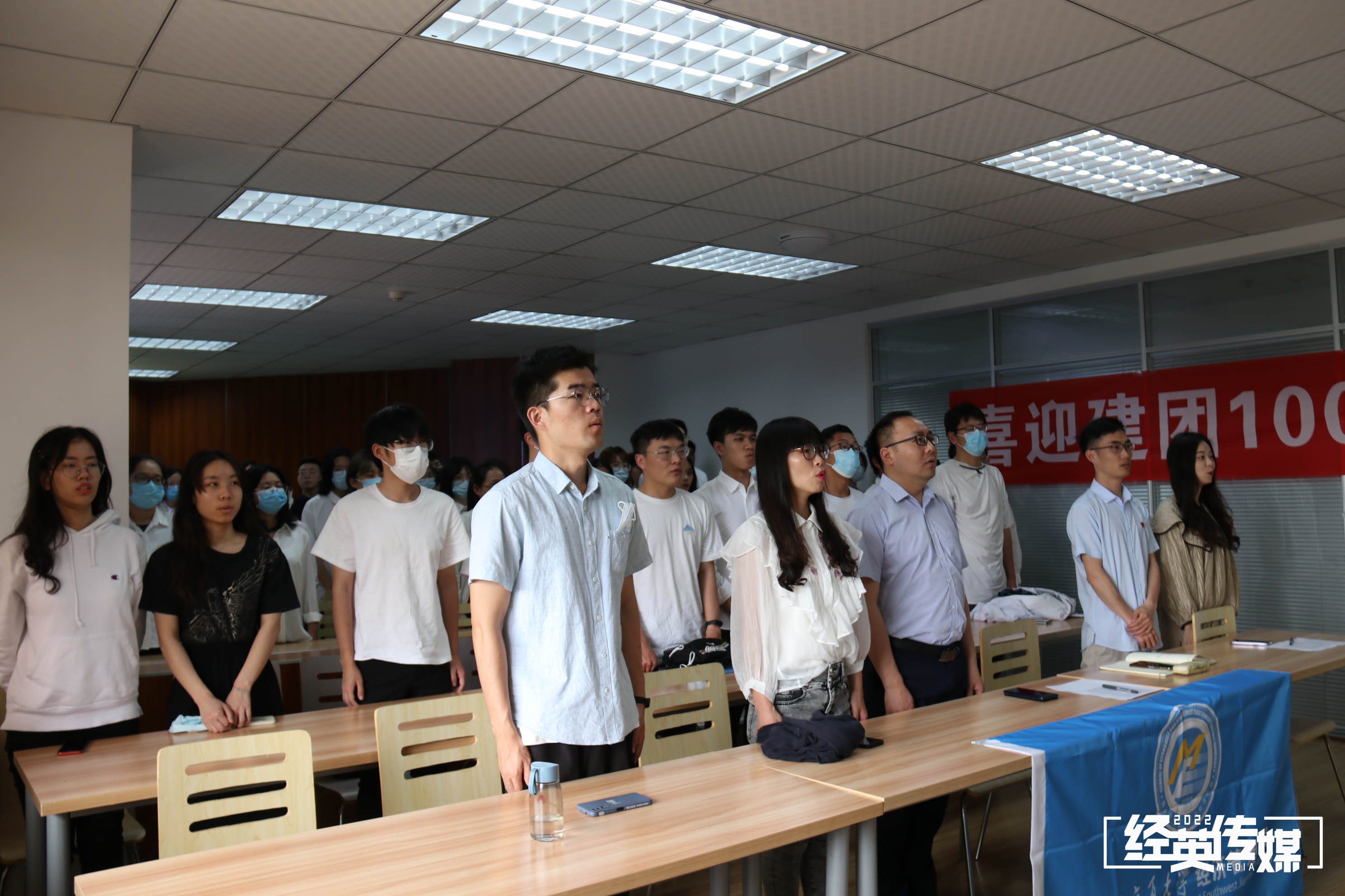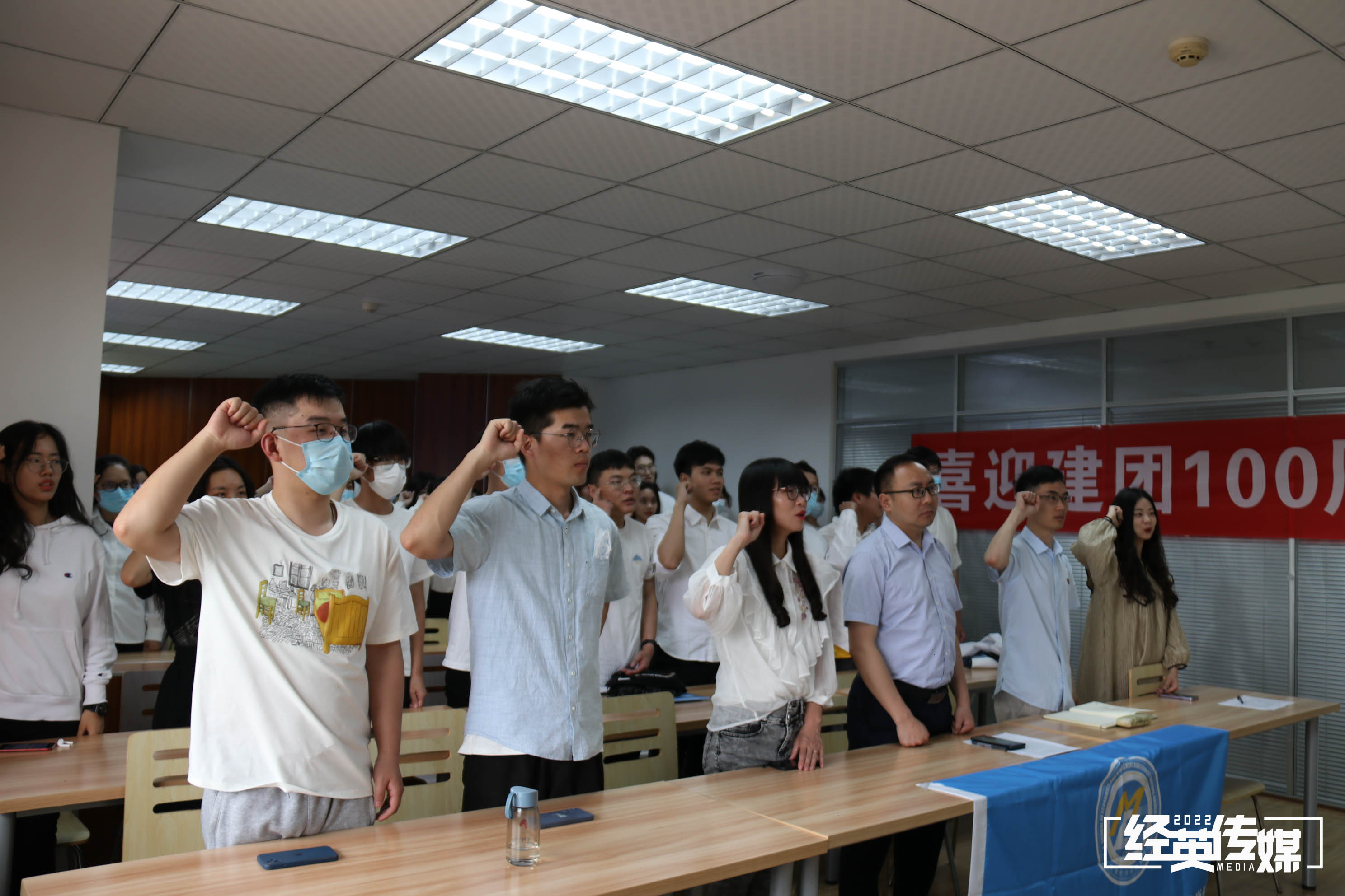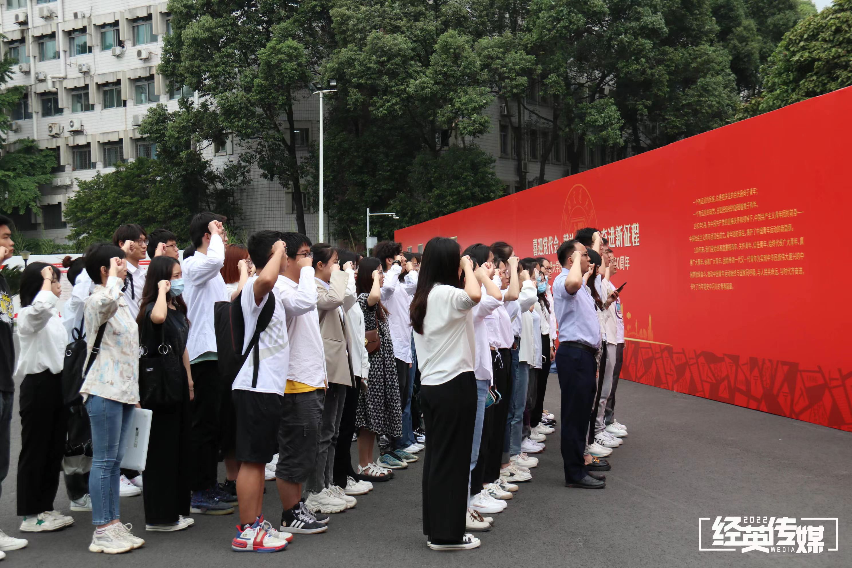 观看完主会场的表彰大会后,多个组织和支部在九里校区以“喜迎党代会、献礼二十大、奋进新征程”为主题的关于中国共青团发展的展板前重温了入团誓词仪式并进行了相应的学习。