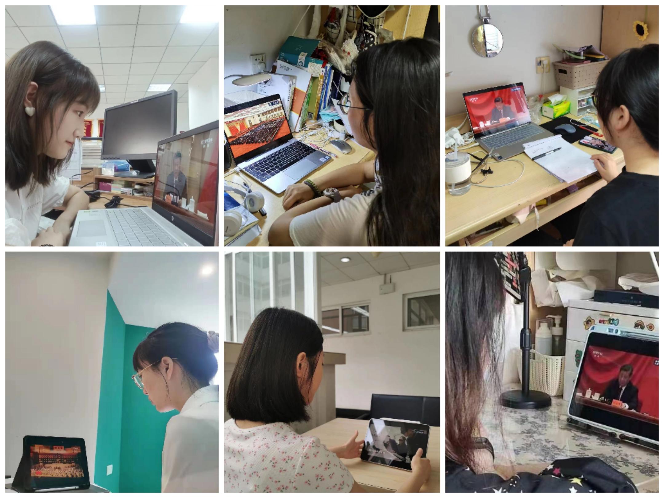 分会场师生认真聆听、学习。同时,同学们热情高涨,各年级未能参与集体观看的同学在寝室、图书馆、教学楼等各个地方观看直播,一起学习领悟习近平总书记重要讲话精神。