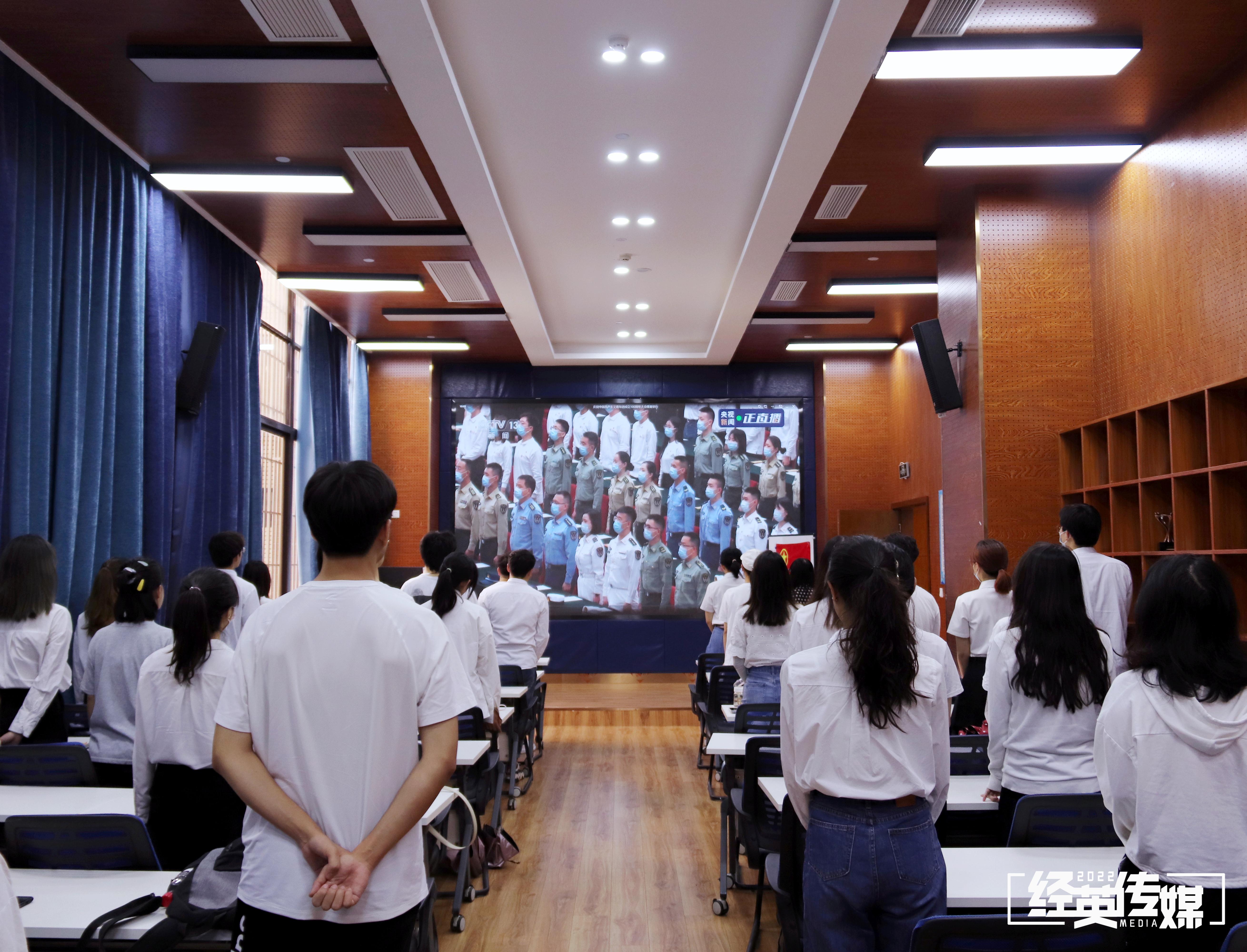 大会开始,师生全体起立,同主会场一起奏唱国歌。