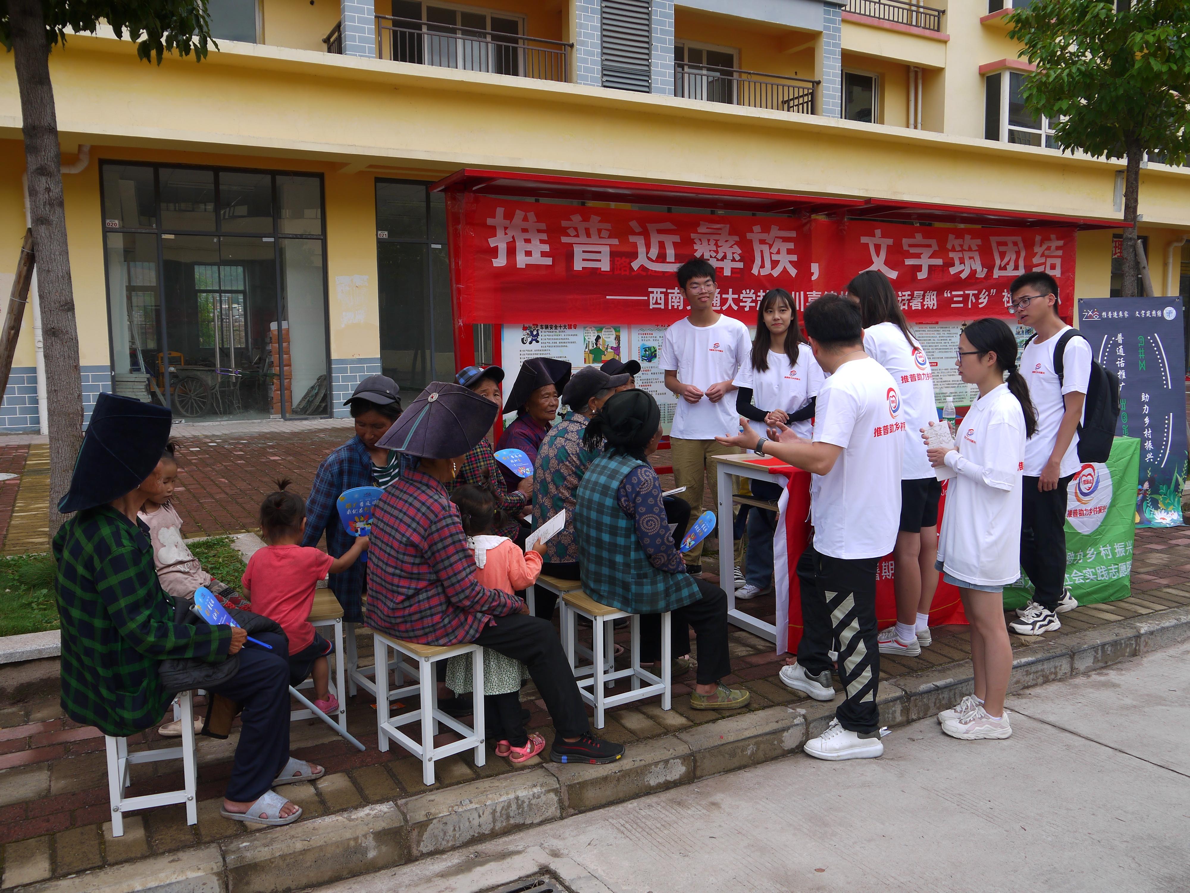 喜德县地处四川省凉山自治州彝族聚居区腹地,彝族人口占90.5%。这里的光明镇彝欣社区是该县最大的易地扶贫搬迁集中安置点,共安置群众1698户,其中易地扶贫搬迁1399户、7084人,是普通话推广的重点地区。实践团队来到彝欣社区通过走访调研、点位宣传、趣味培训、红色课堂等方式开展普通话调研和推广活动,以文化凝聚共识,以共识汇聚力量。