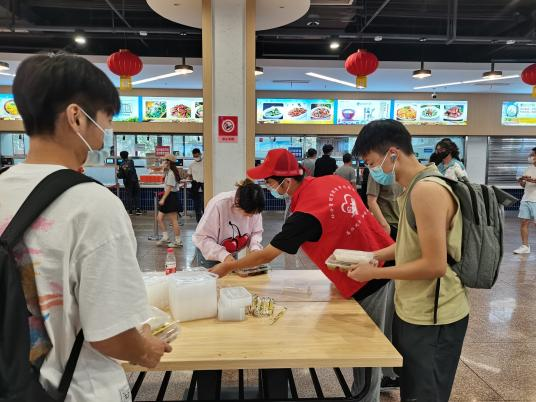 志愿者们身着志愿马甲积极投身各个服务岗位,“红色”身影遍布校园每个角落。他们在核酸检测点测量体温,维持队列秩序;他们在食堂门口提醒同学们佩戴好口罩,为同学们排忧解惑;他们在食堂内维持排队秩序,并主动帮同学们打包餐盒。